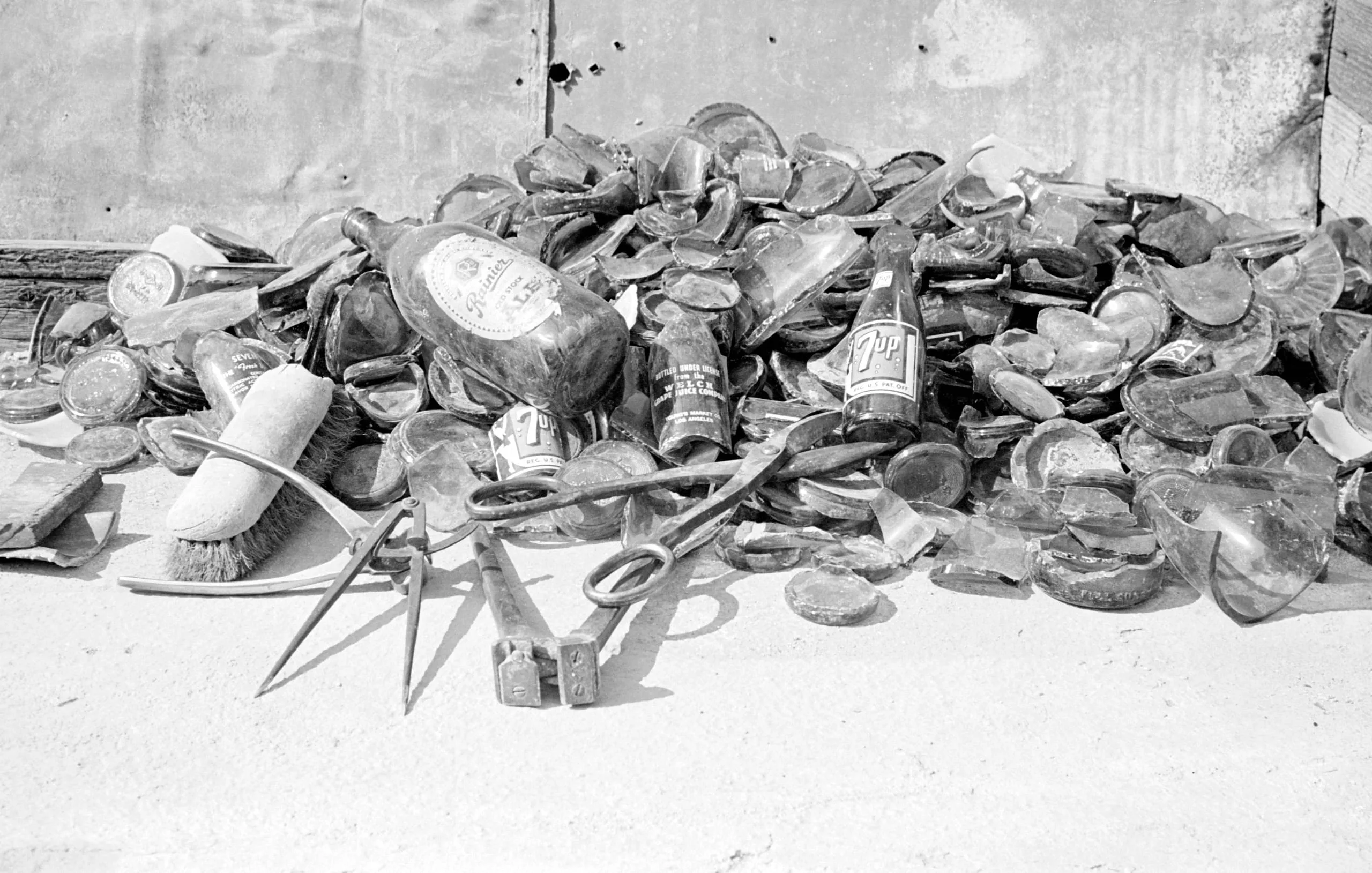 Black and white photograph of a large pile of crushed cans and broken glass against a wall, with scissors, skeleton keys, and a scrub brush arranged in front