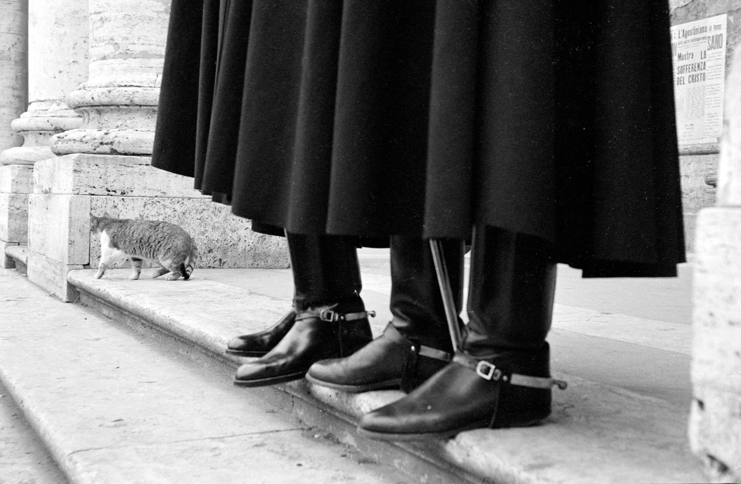 Black and white photograph, lower halves of two figures in long black cassocks and buckled shoes standing on stone steps, a tabby cat crouching at the base of a column to the left