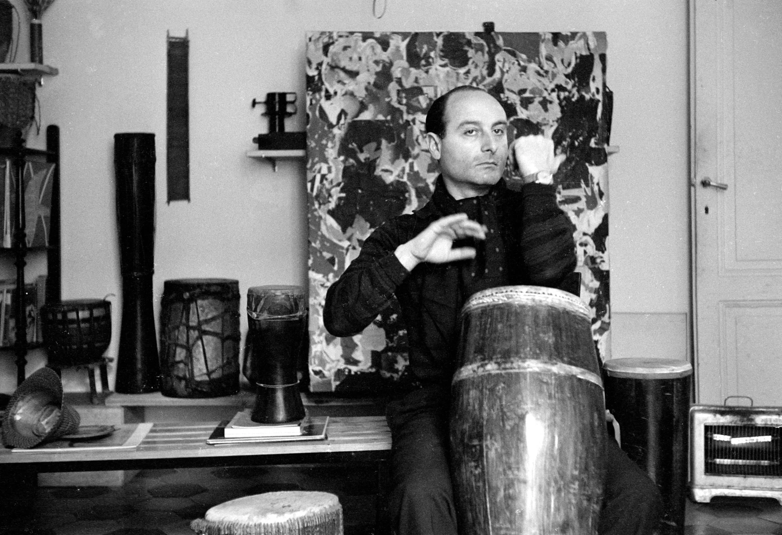 Black and white photograph of a man seated in a studio, surrounded by drums, with a large abstract painting behind him