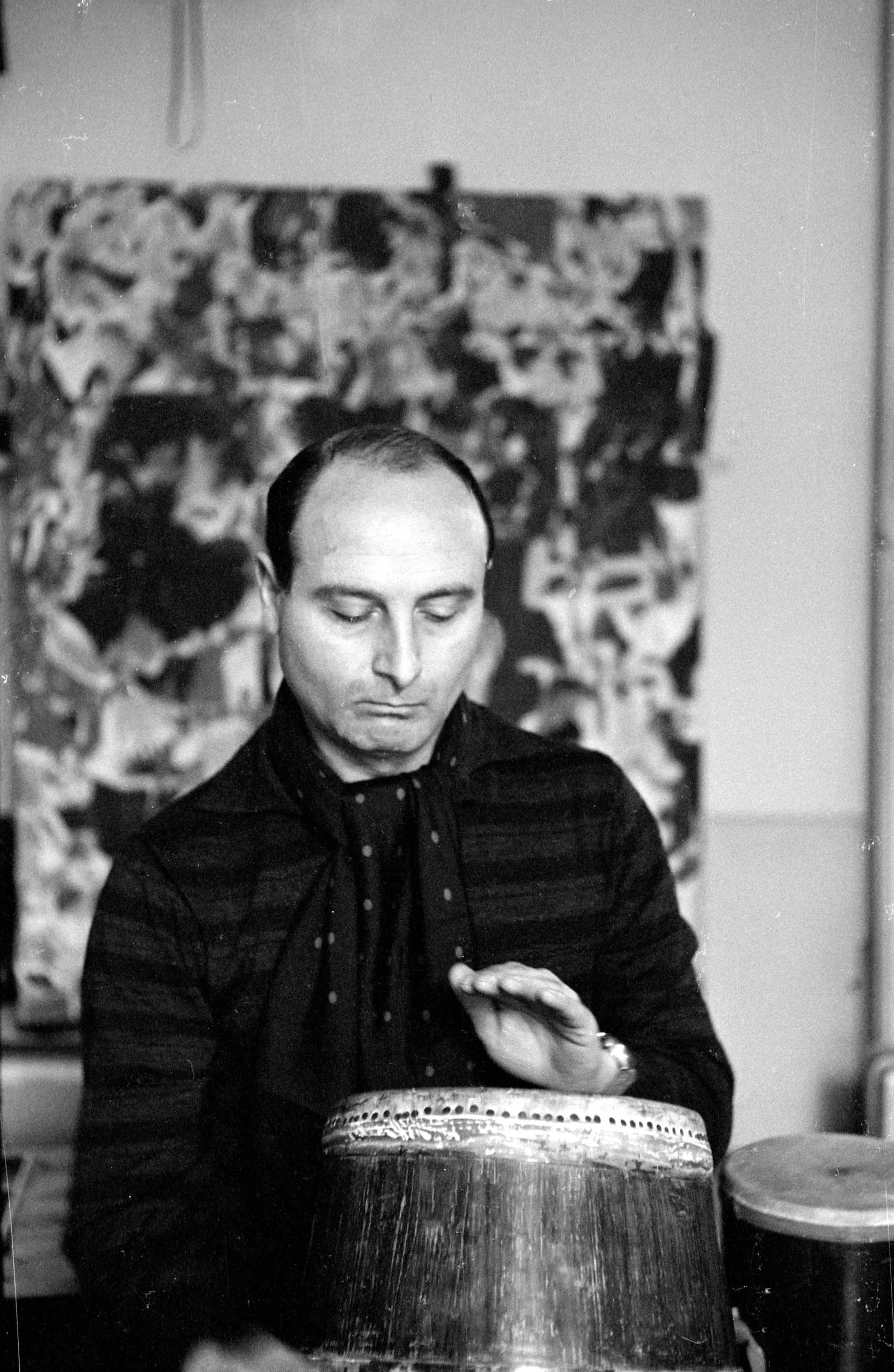 Black and white photograph of a man looking downward at a fringed cylindrical drum, with a large abstract painting visible on the wall behind him