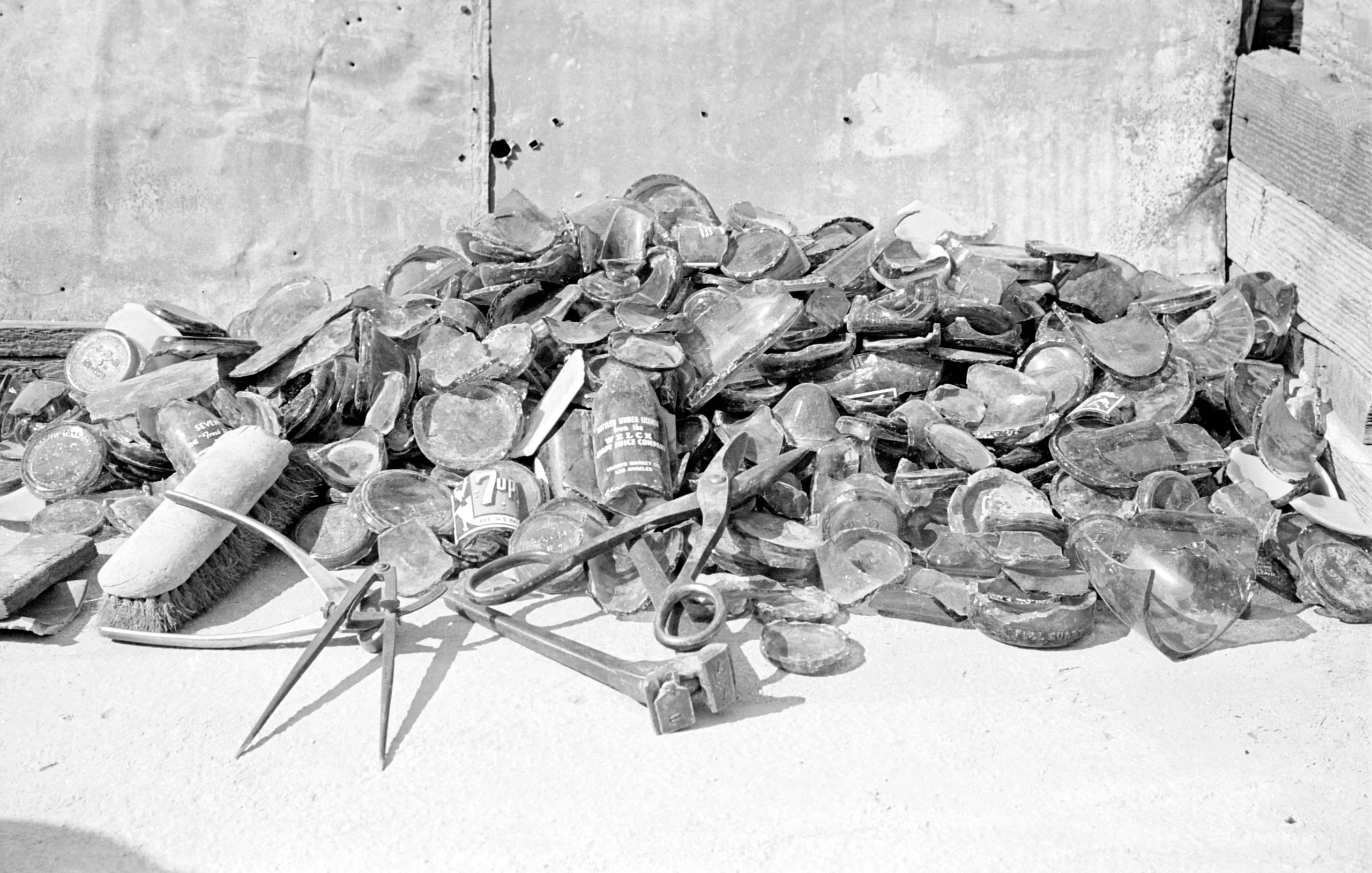 Black and white photograph of a large pile of crushed, open tin cans heaped against a concrete wall, with scissors, a brush, and a funnel in front