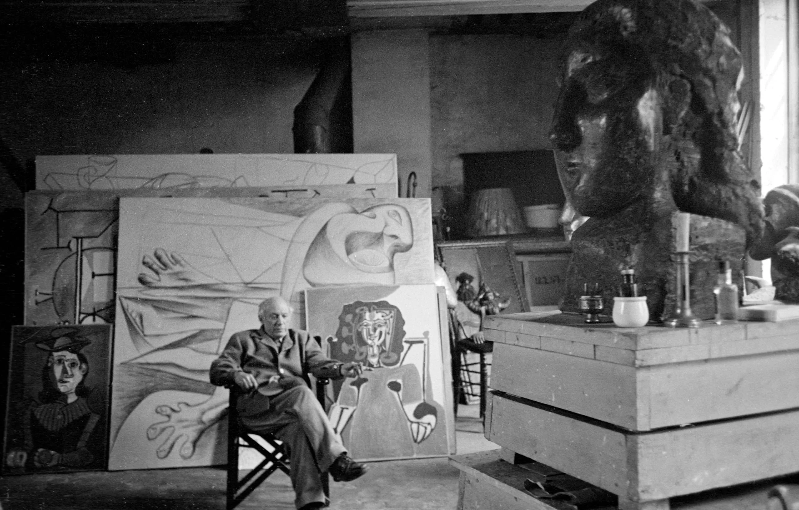 Black and white photograph of an older man seated in a folding chair inside an artist's studio, surrounded by large abstract canvases and a monumental sculptural bust