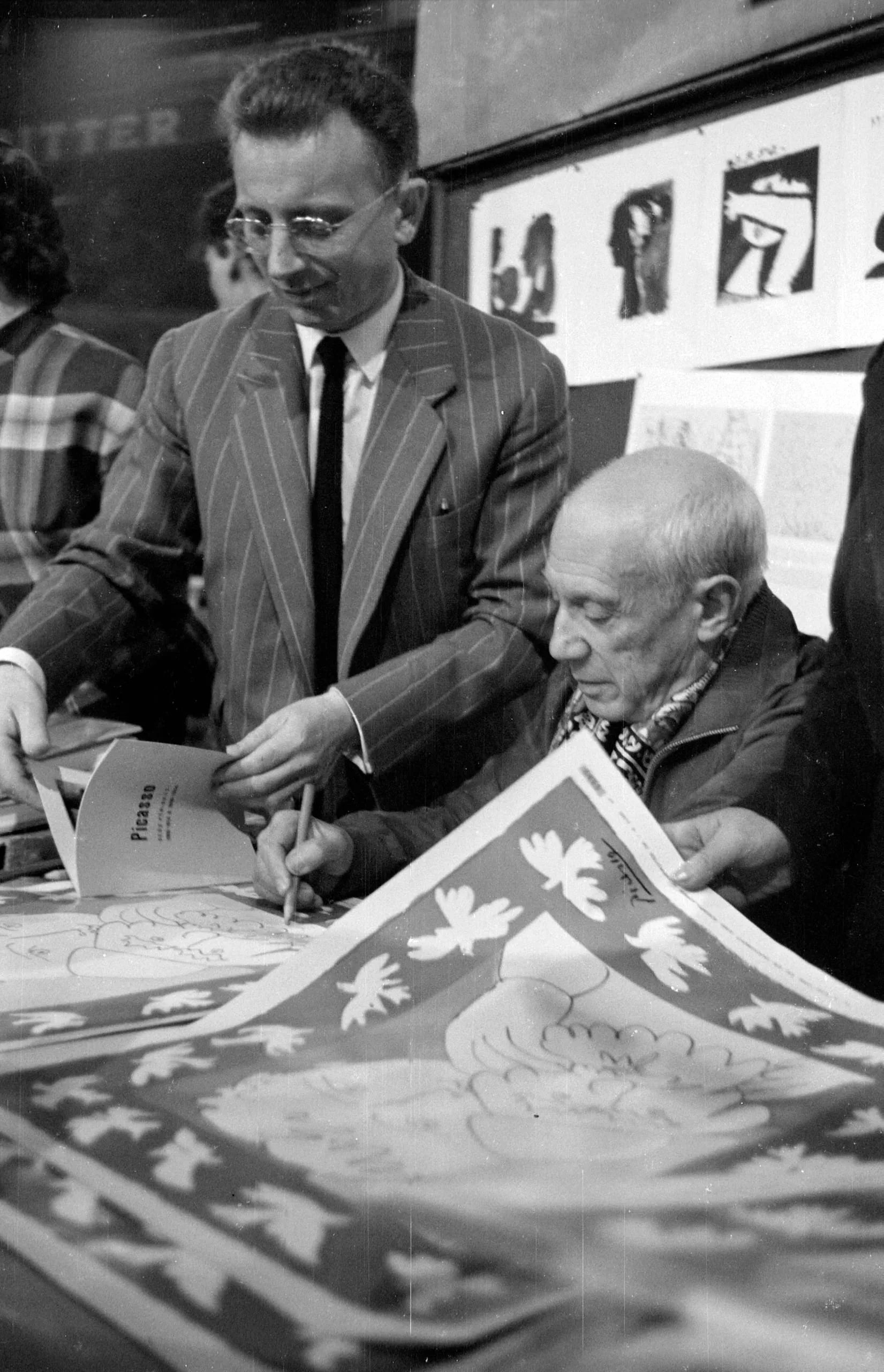 Black and white photograph of two men leaning over a large sheet printed with bold leaf and floral patterns, with a booklet reading 'Picasso' visible on the sheet
