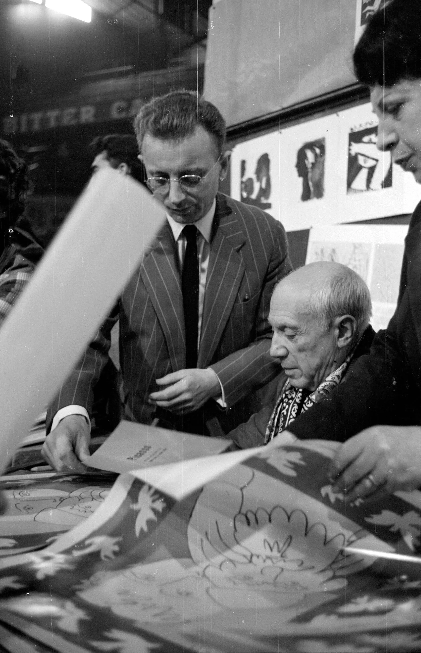 Black and white photograph of two men examining large printed sheets with bold floral line drawings, a third figure partially visible at right, prints displayed on wall behind them