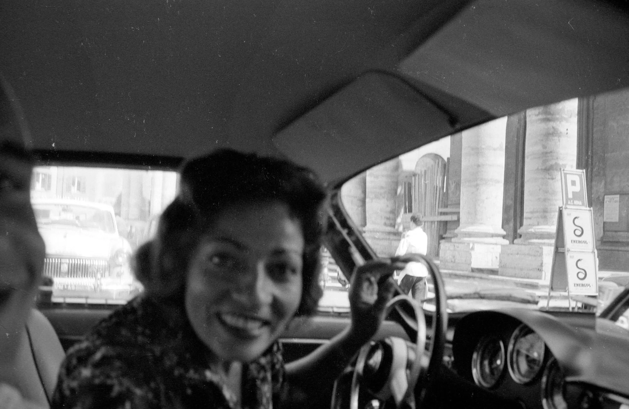 Black and white snapshot photograph, a woman with dark curly hair smiles at the camera from the driver's seat of a mid-century car, city street and stone columns visible through the windshield