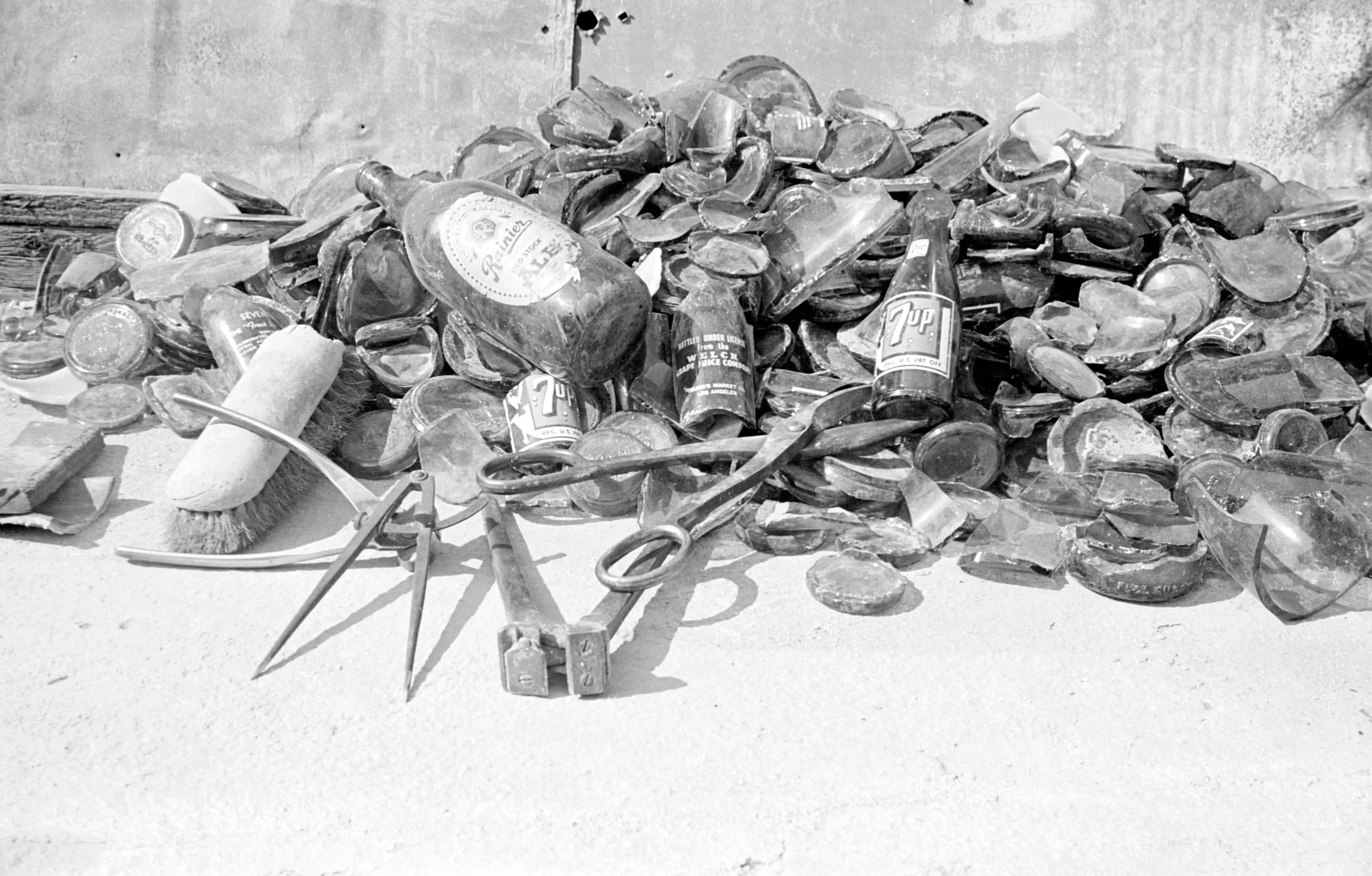 Black and white photograph of a large pile of flattened bottle caps and crushed soda bottles against a concrete wall, with scissors, a brush, and a key arranged in the foreground