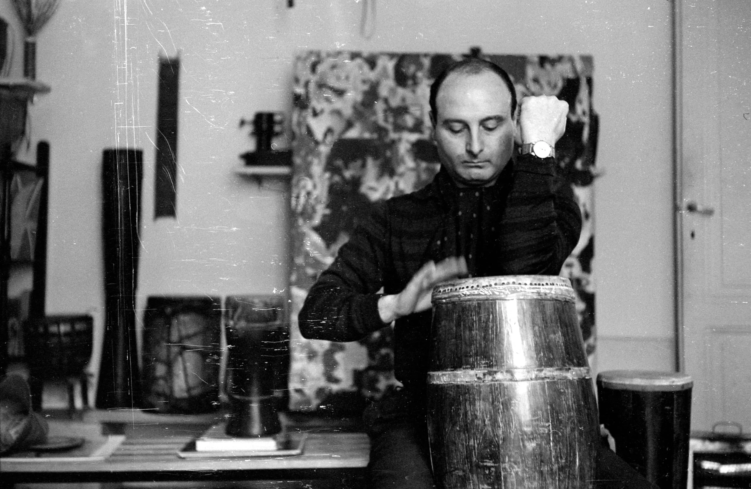 Black and white photograph of a man in a striped sweater leaning over a wooden barrel in an artist's studio, a large abstract painting visible behind him