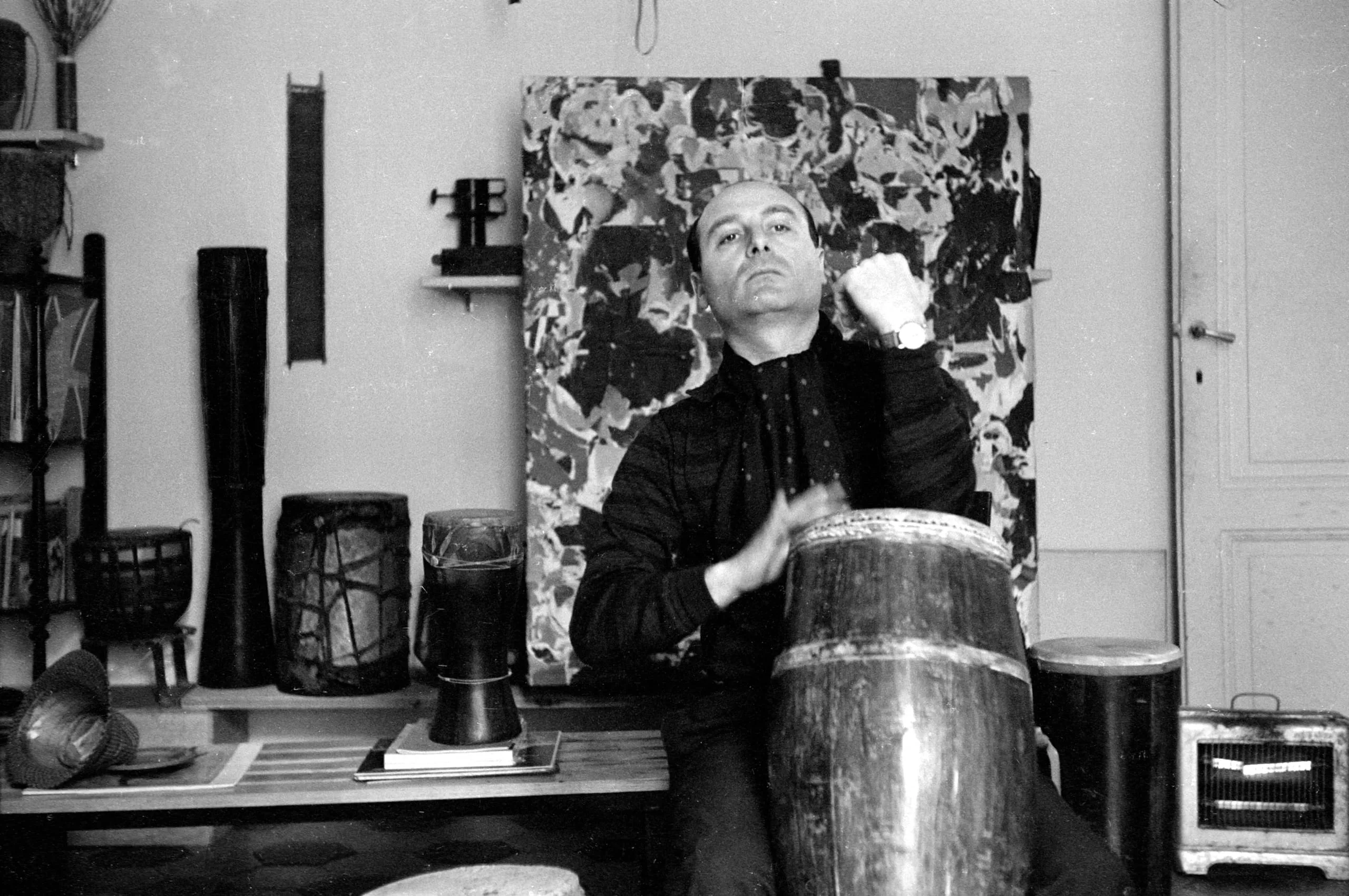 Black and white photograph of a bald man in a black shirt playing a tall barrel drum in an artist's studio, a large abstract painting visible behind him