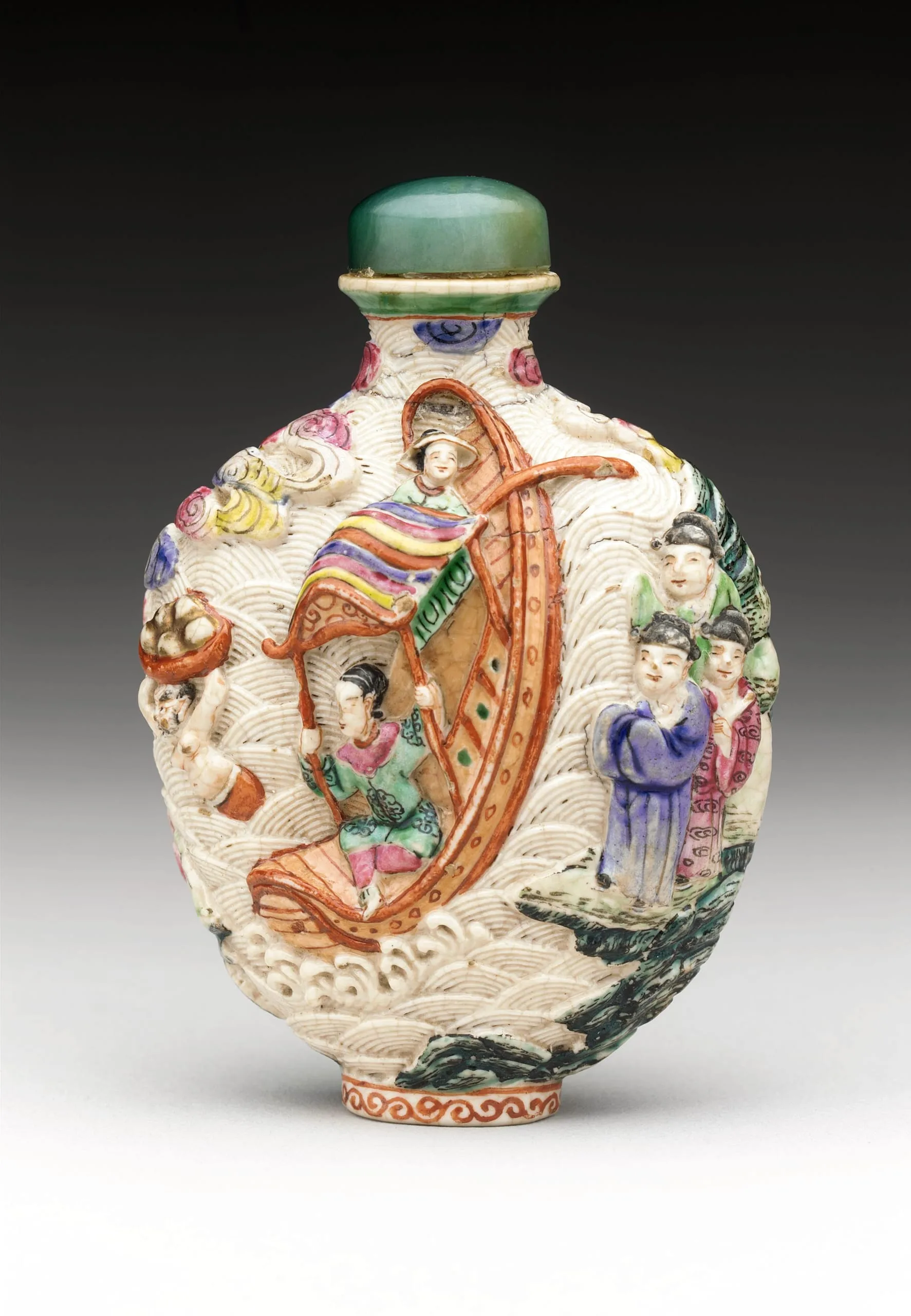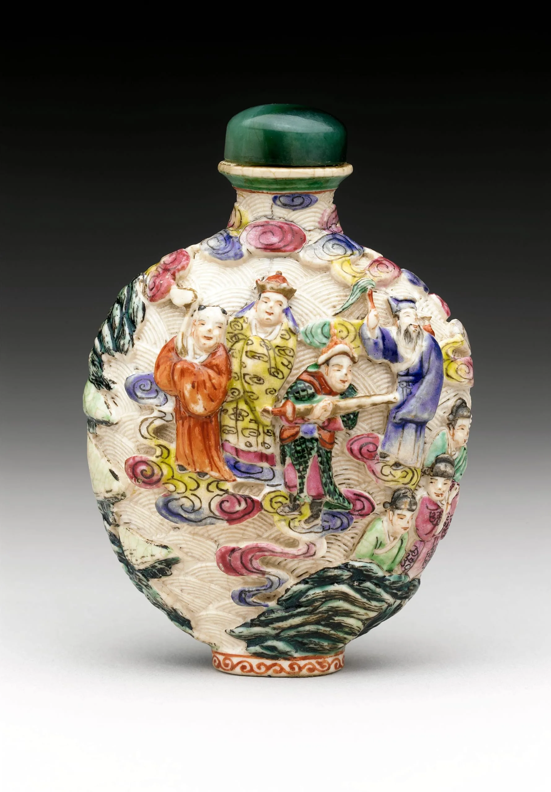 - Molded soft-paste porcelain with overglaze enamel decoration, with hardstone stopper