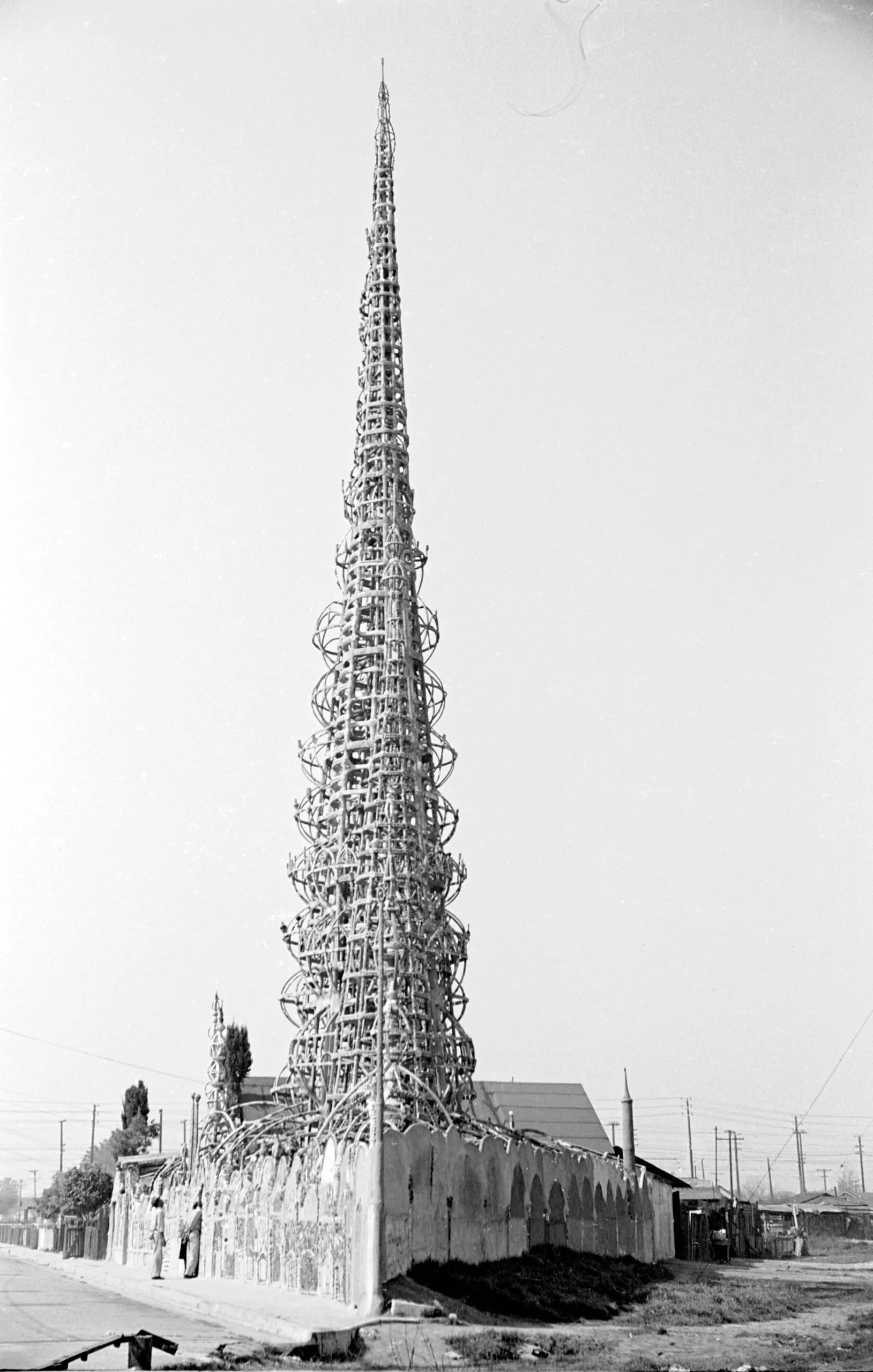Black and white photograph of a tall, skeletal spire built from rods and circular hoops rising above a mosaic-covered concrete wall, with a small figure standing at its base