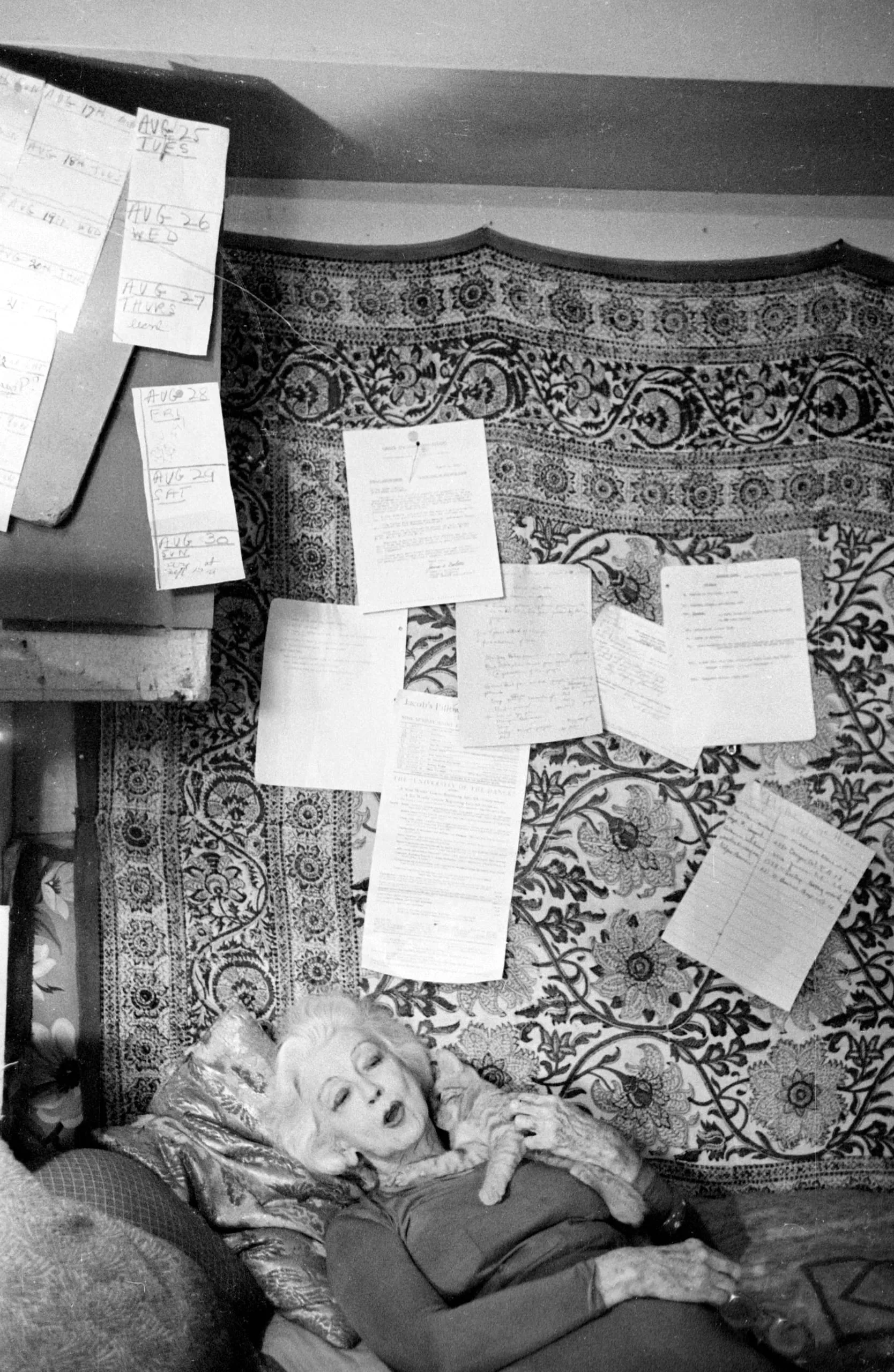 Black and white photograph of an elderly white woman reclining on a floral-patterned fabric, surrounded by handwritten and typed papers pinned above her