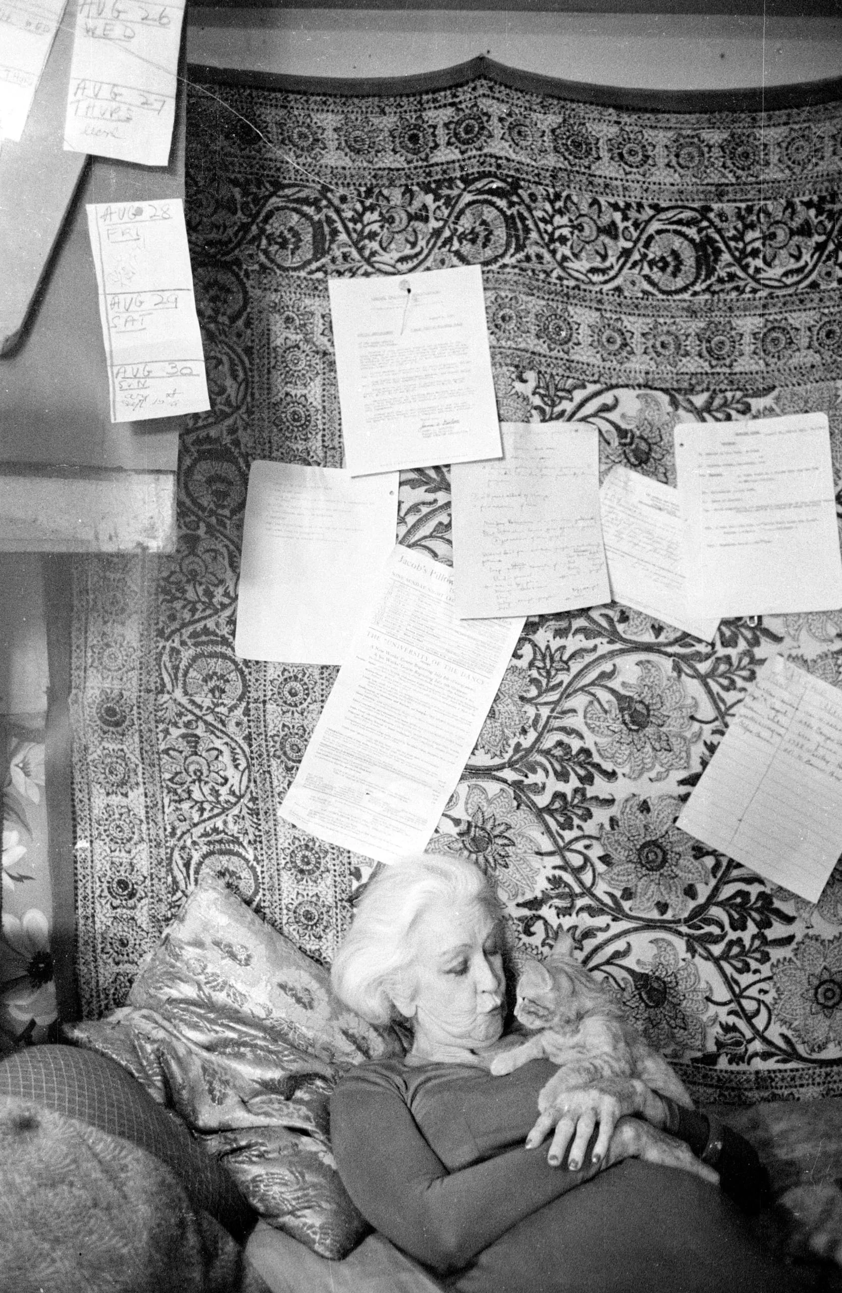 Black and white photograph of a white-haired woman reclining against a floral textile hung with handwritten and typed papers, holding a cat to her chest