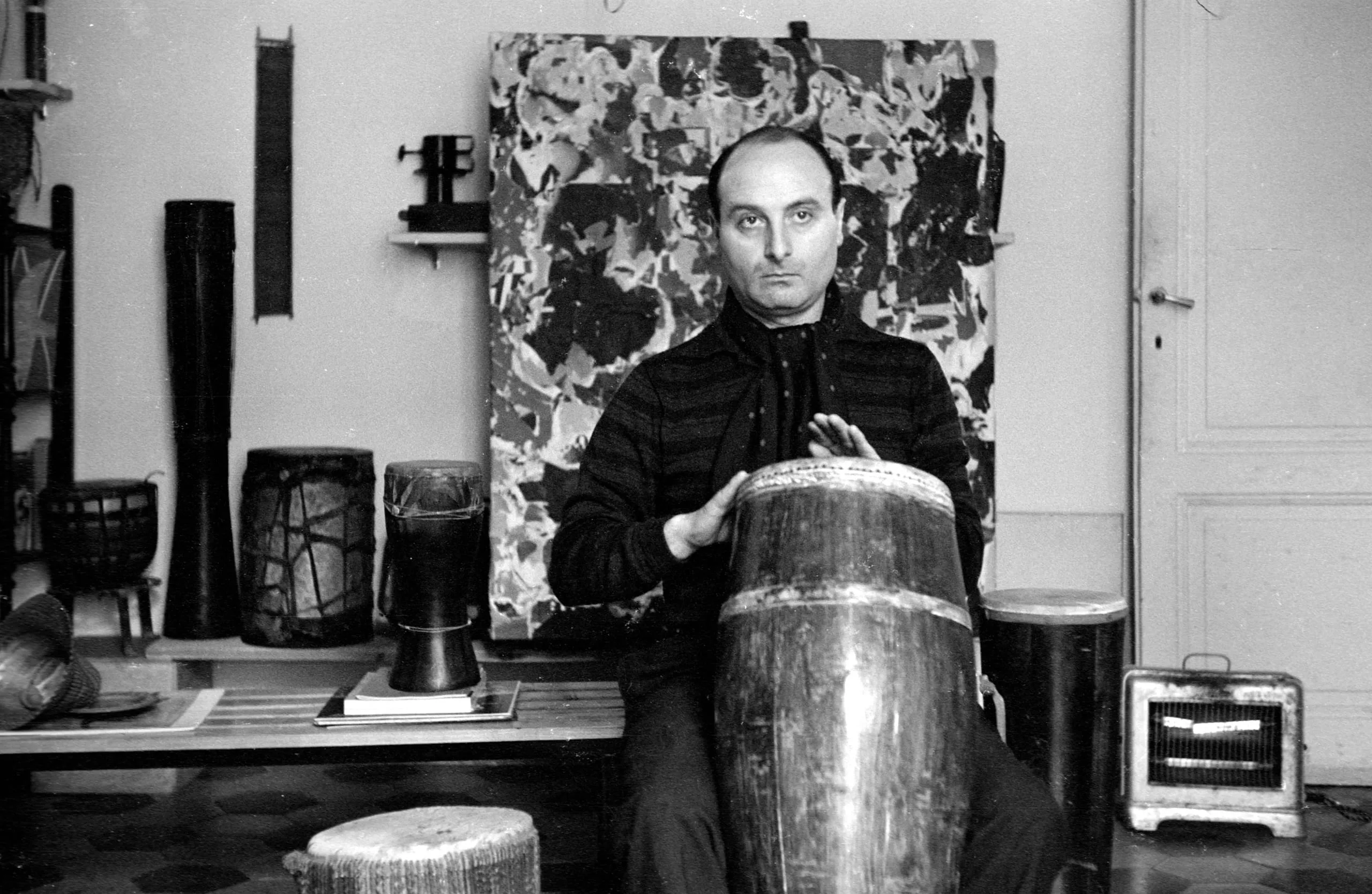 Black and white photograph of a bald man in a dark shirt seated among percussion drums in a studio, with a large abstract canvas behind him