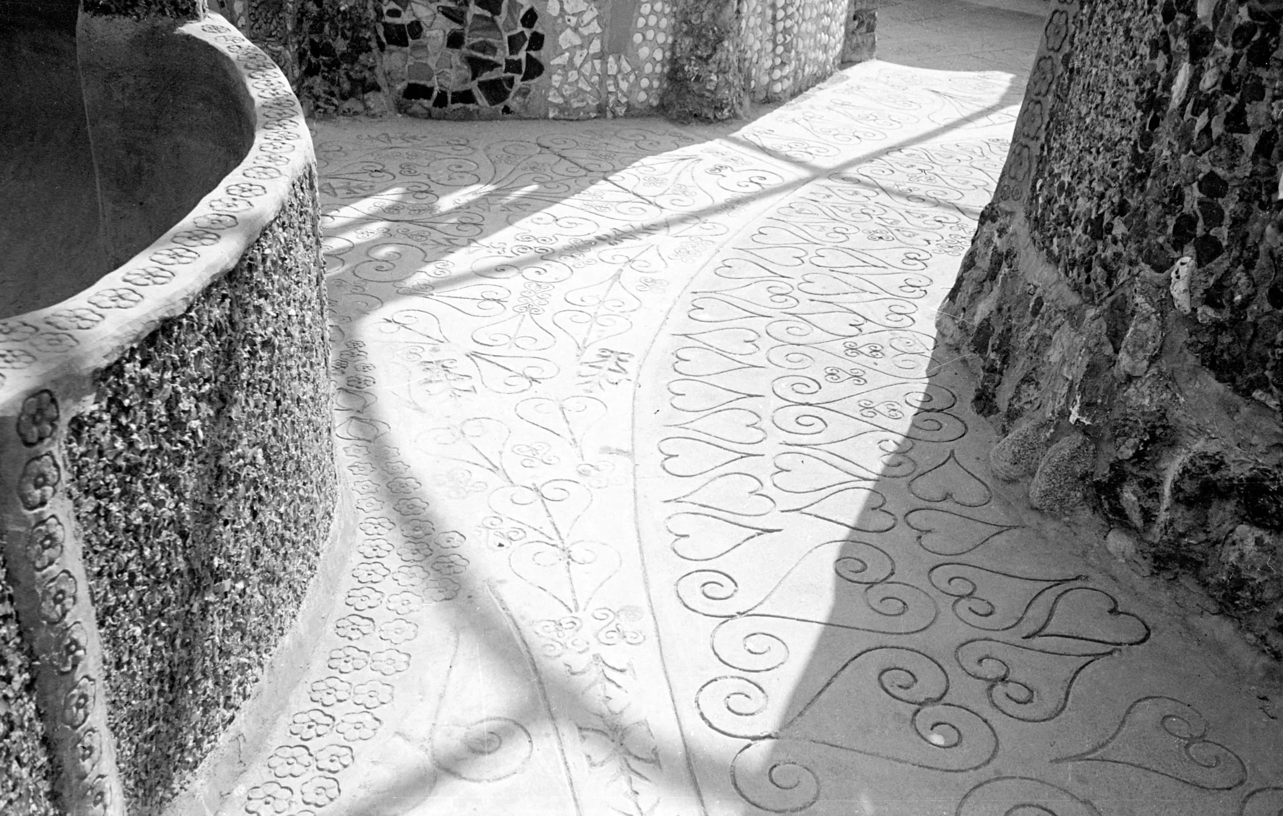 Black and white photograph looking down onto a decorative stone terrace floor with incised scrollwork and floral patterns, flanked by mosaic-covered and rough stone walls