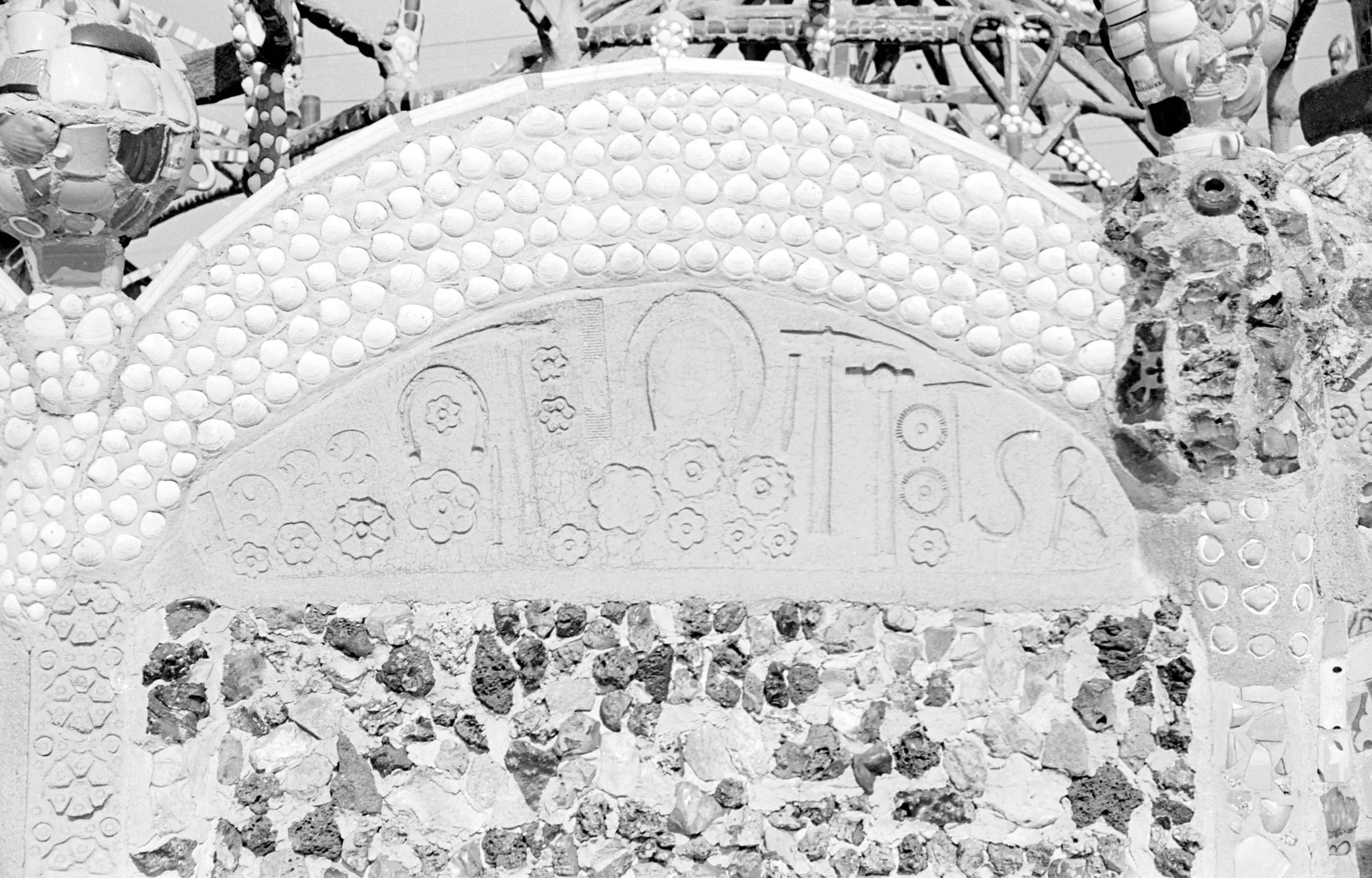Black and white photograph of a decorative concrete arch covered with dome-shaped embedded objects and low-relief carved symbols, flanked by encrusted sculptural elements