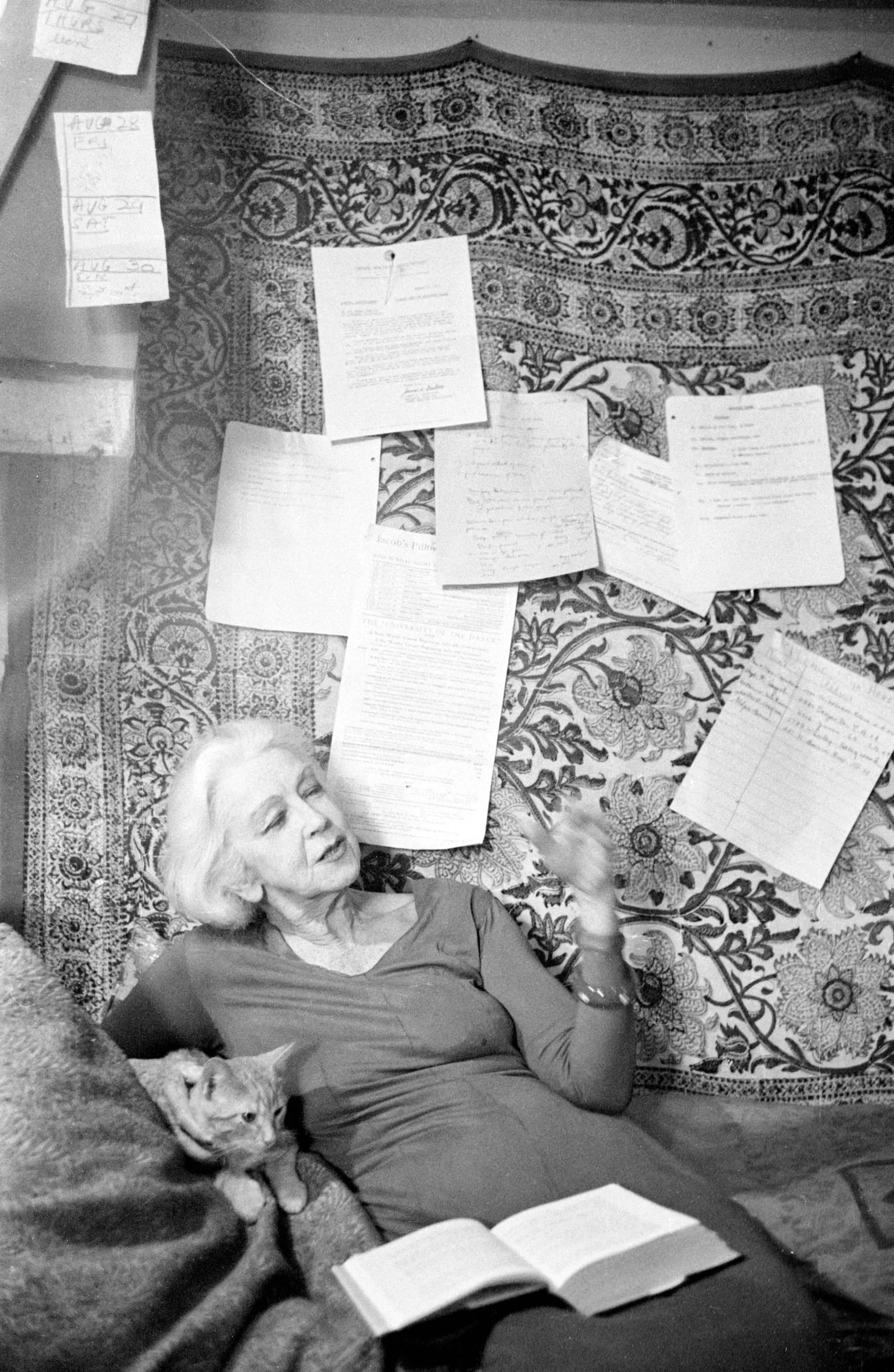 Black and white photograph of an older white woman reclining against a floral tapestry pinned with papers, holding a cat and an open book, gesturing mid-speech