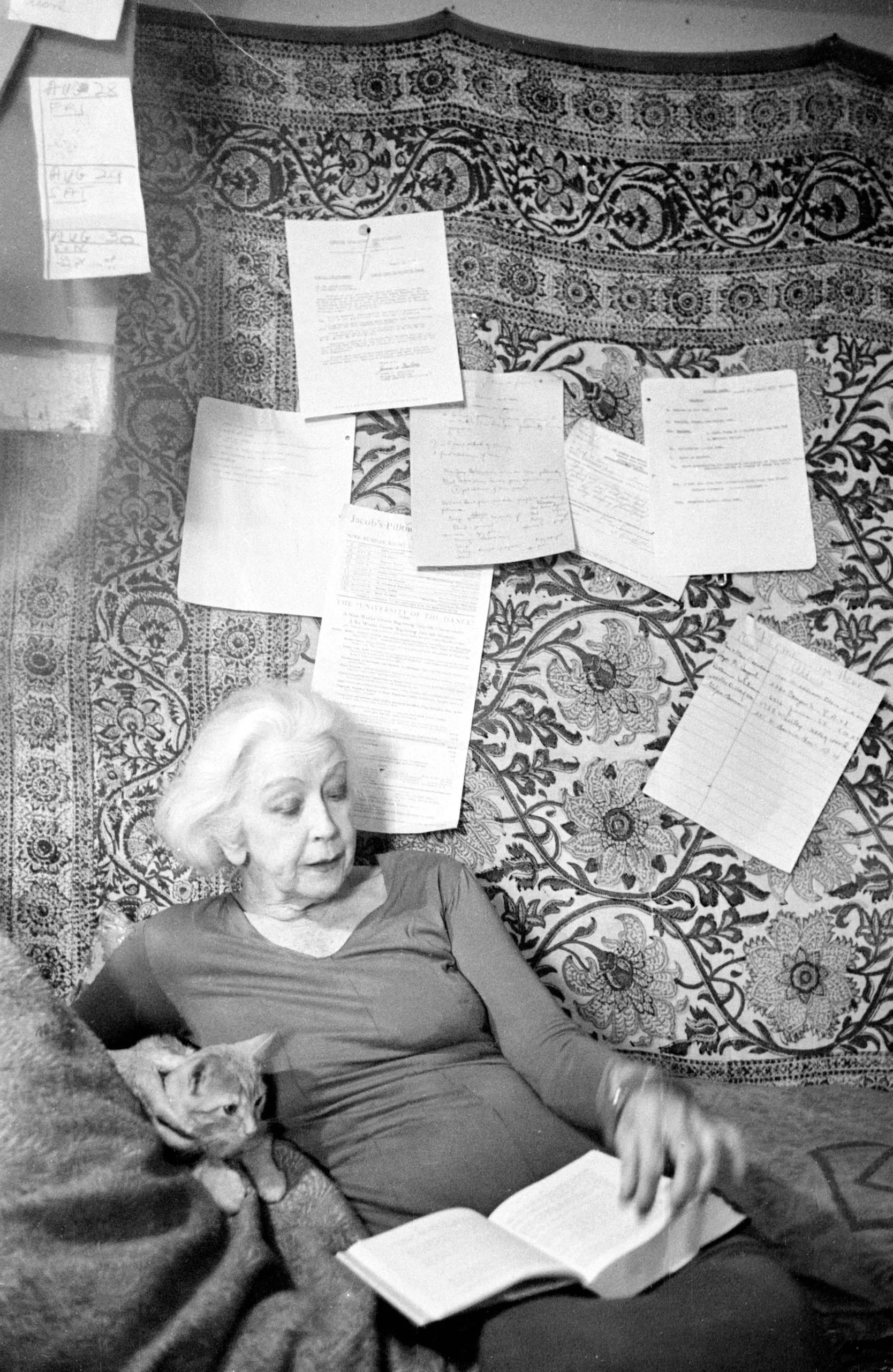Black and white photograph of a white-haired woman reclining with an open book and a small cat, backed by a patterned textile hung with handwritten and typed pages
