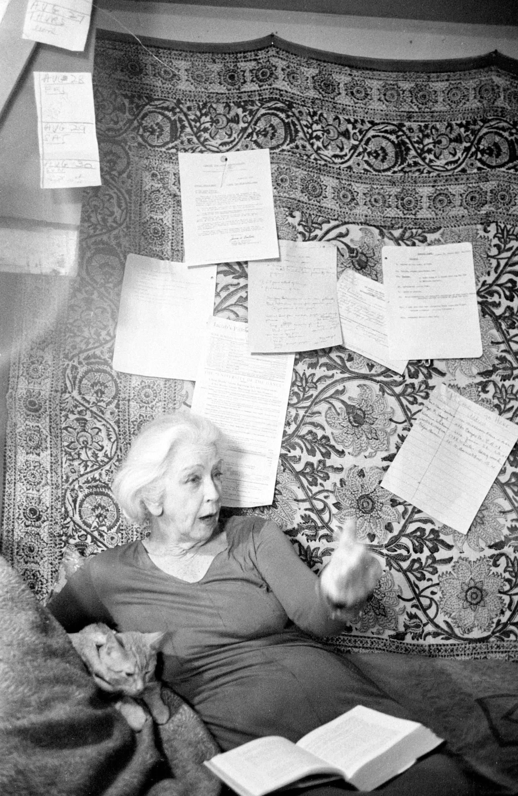 Black and white photograph of an elderly white woman with white hair reclining against a patterned fabric hung with handwritten and typed papers, a cat at her side and an open book nearby