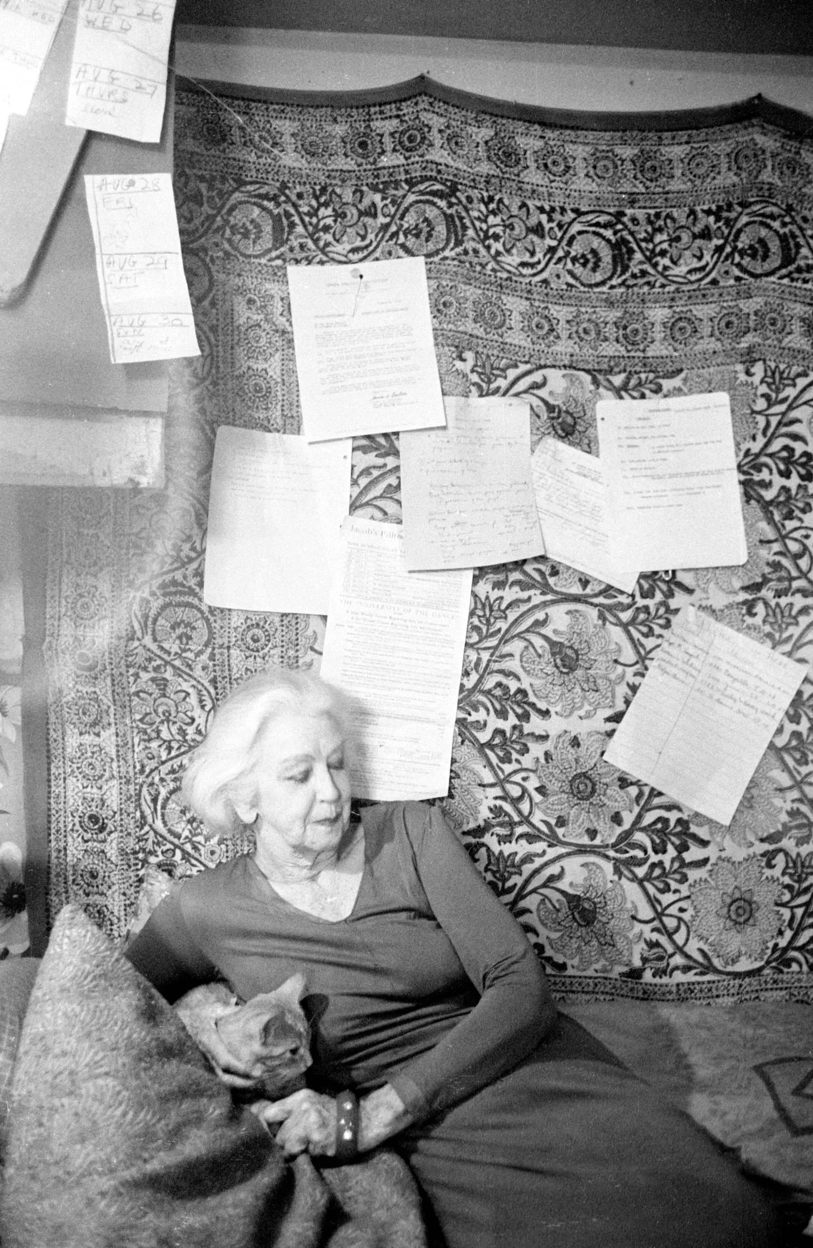 Black and white photograph, elderly white woman with short white hair seated against a floral textile hung with pinned papers, cradling a cat