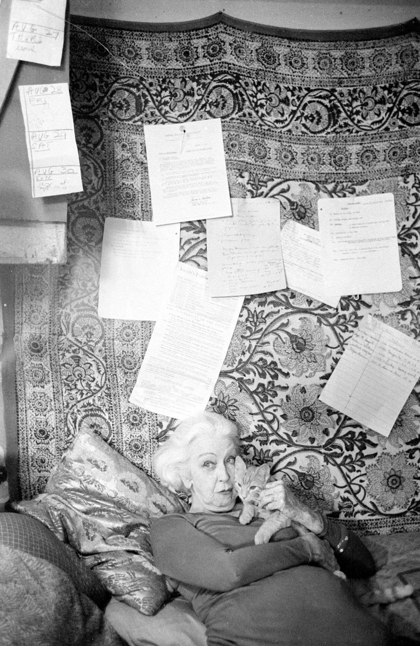Black and white photograph of a white-haired woman reclining against a floral textile hung with handwritten papers, holding a small kitten to her chest