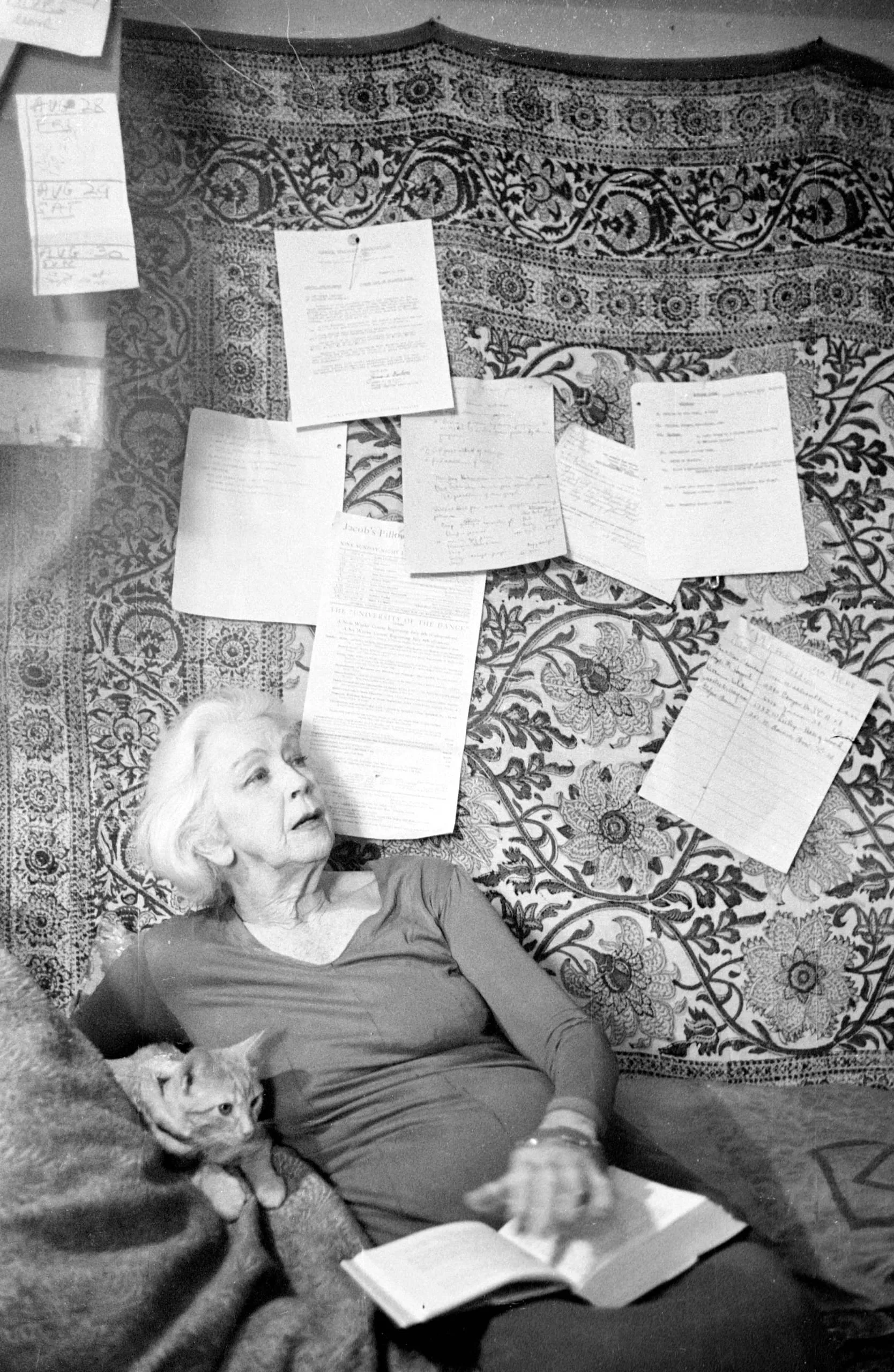 Black and white photograph of an older white woman reclining against a floral tapestry pinned with loose handwritten and typed papers, holding an open book and a small kitten