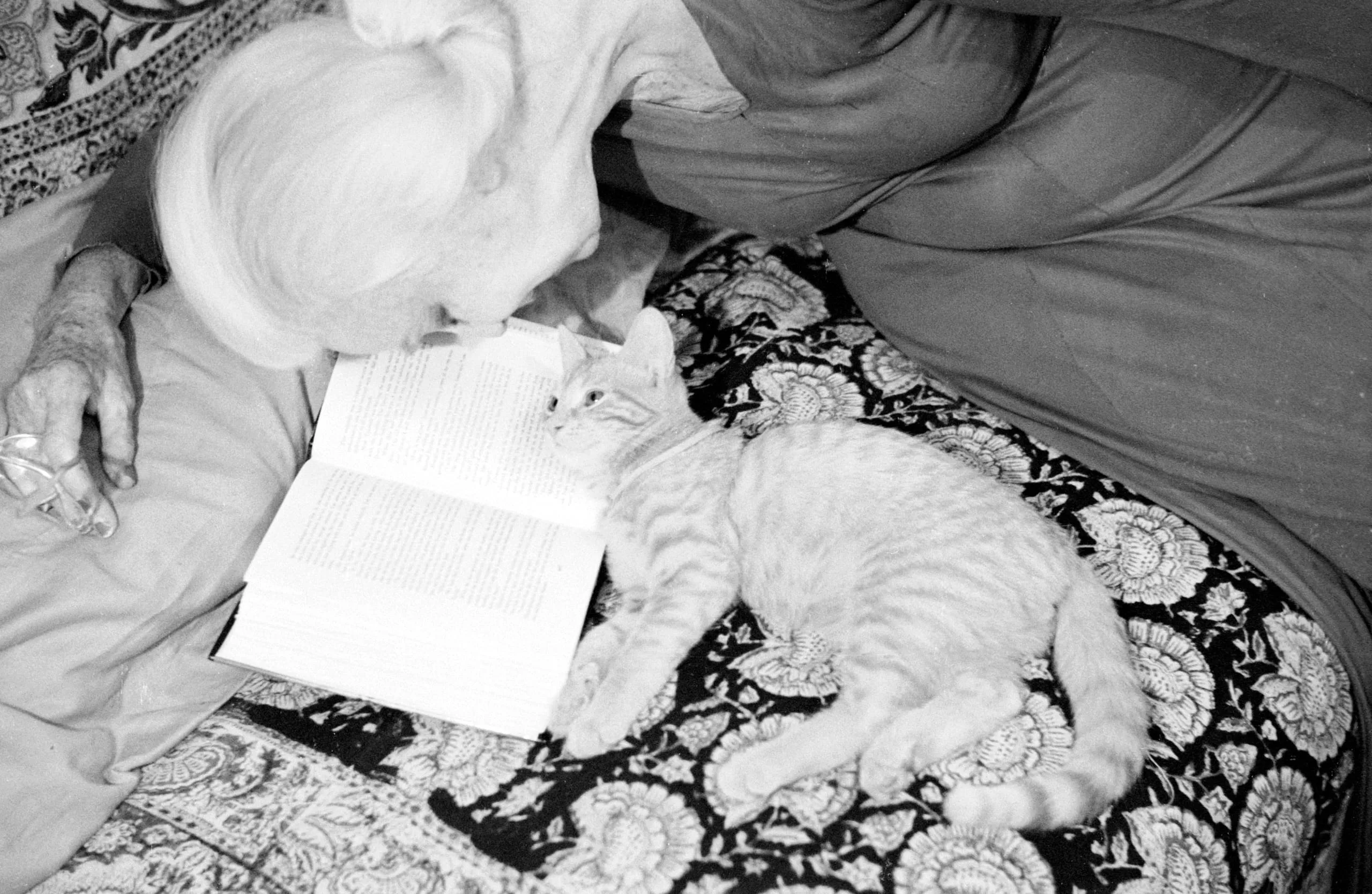 Black and white photograph of an elderly person with white hair leaning down to nuzzle a small tabby cat resting on an open book atop a floral-patterned textile
