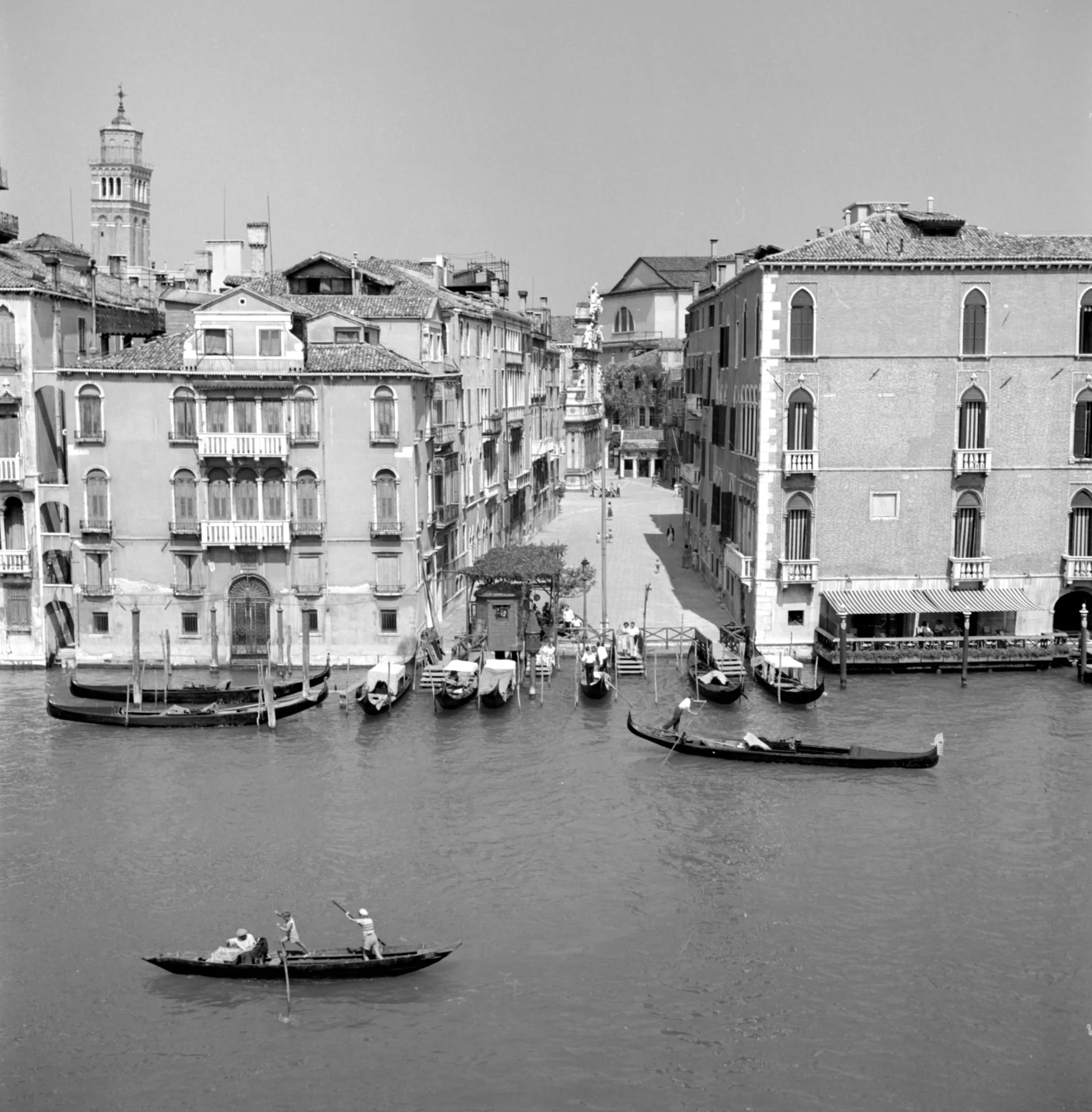 Black and white photograph looking down onto a Venetian canal with gondolas in the foreground and multi-story palazzos lining both banks, a narrow street receding between them toward a bell tower