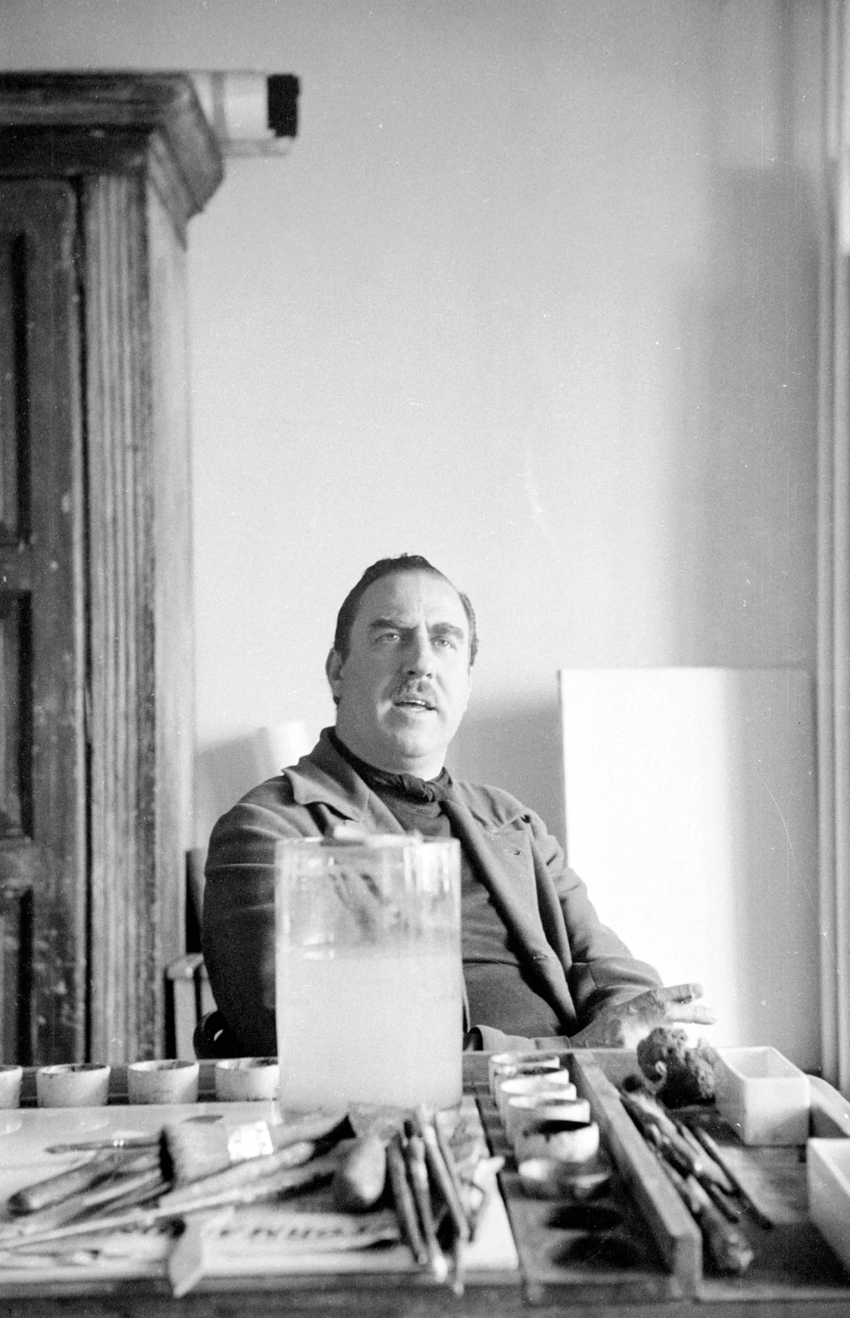 Black and white photograph of a man seated at an artist's worktable scattered with brushes and containers, head tilted back, gaze directed upward