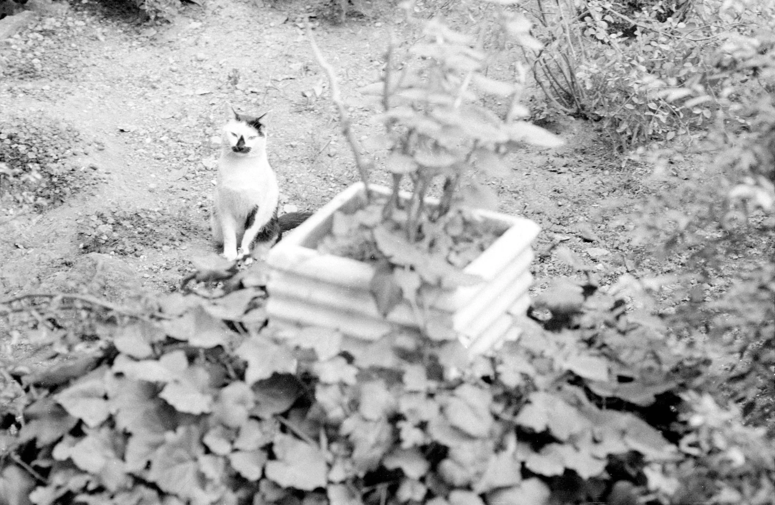 Black and white photograph, slightly elevated view of a white cat with dark markings sitting in a bare garden patch beside a rectangular planter box filled with leafy plants