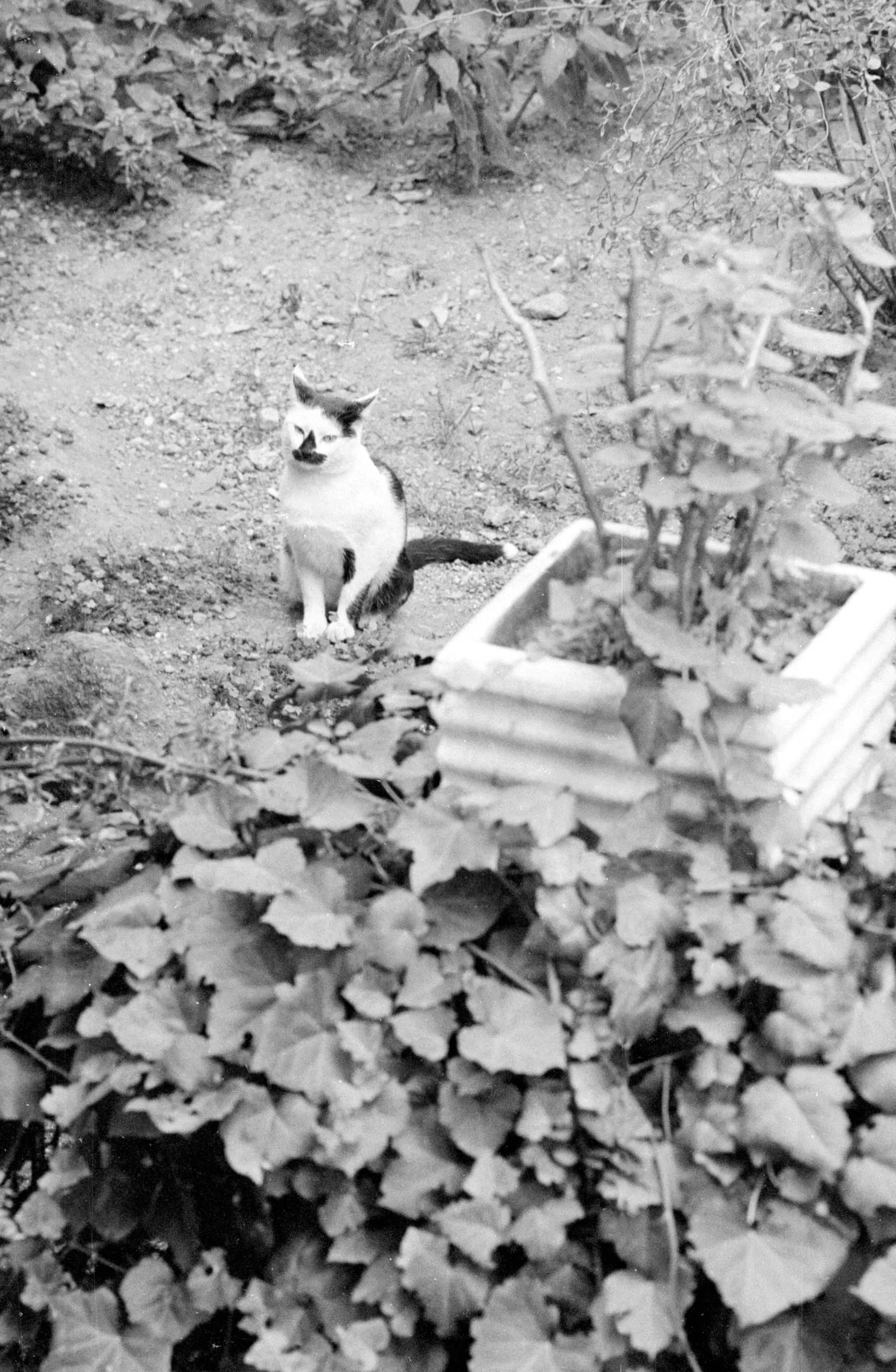 Black and white photograph, a cat with dark facial markings sits on bare garden soil, looking upward at the camera, surrounded by broad-leafed plants and a wooden planter box