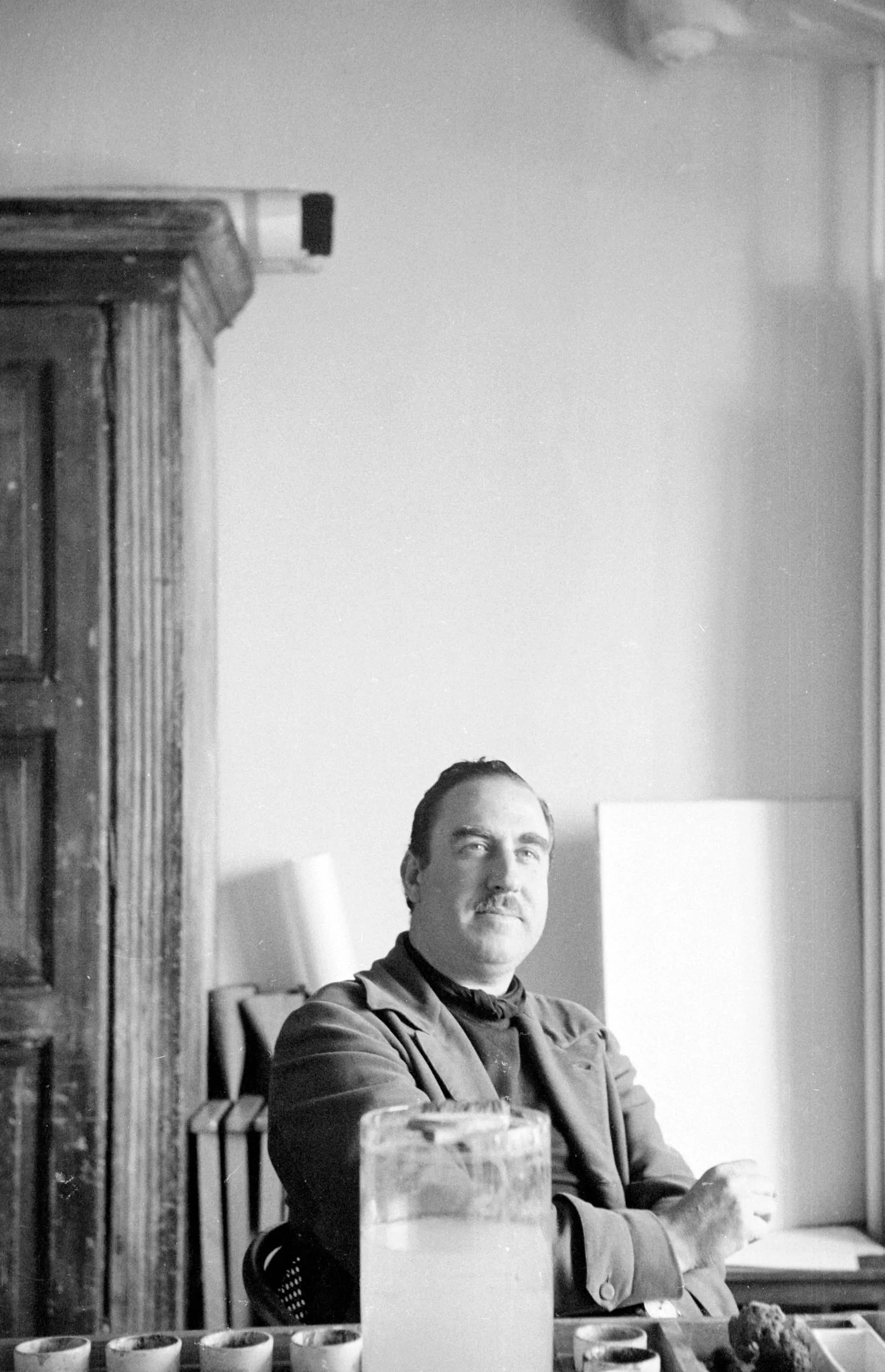 Black and white photograph of a middle-aged man with a mustache seated at a table, arms crossed, looking up and to the right, in a room with a wooden cabinet and stacked panels behind him
