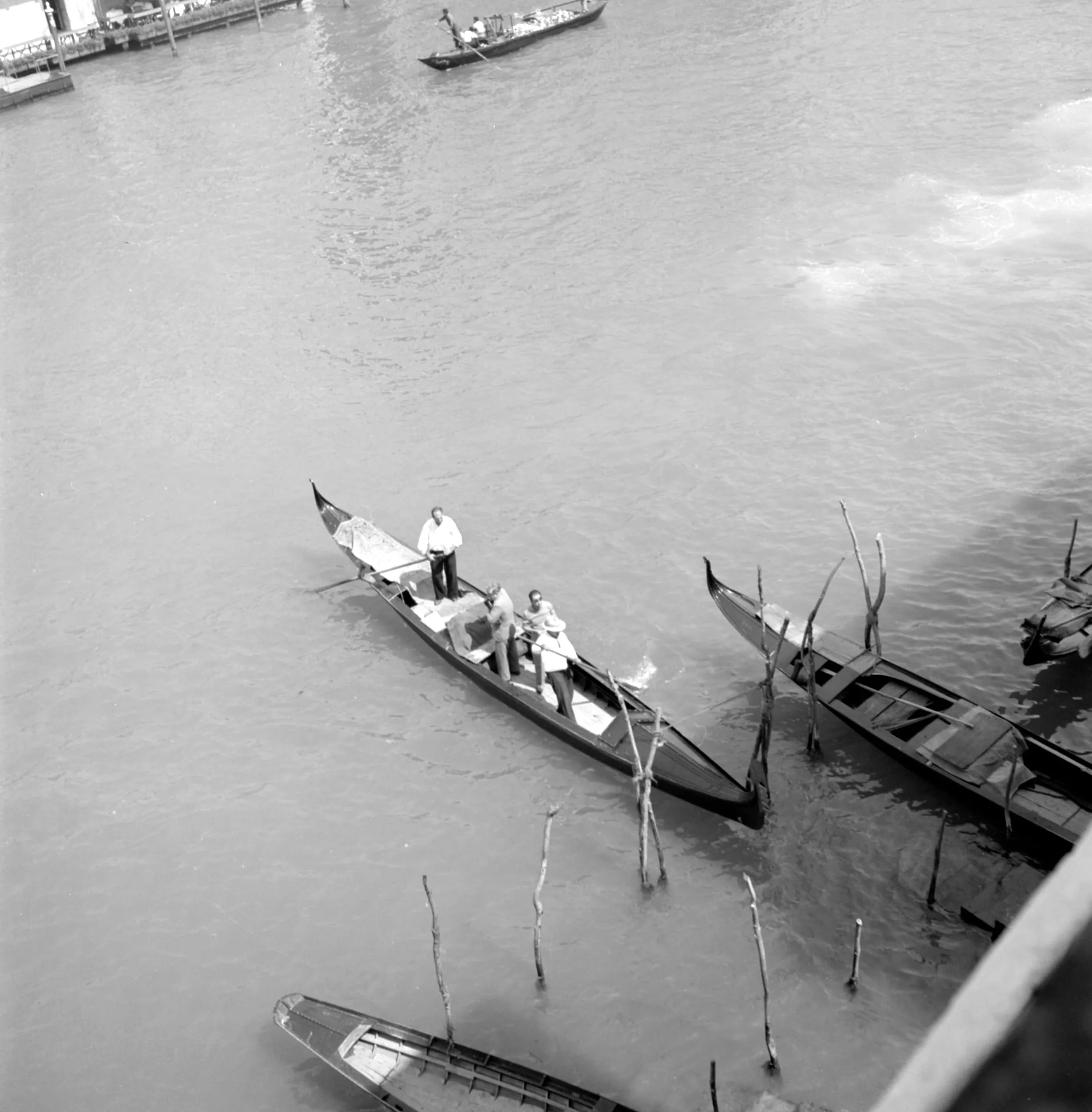 Black and white photograph shot from above, looking down onto a canal with a gondola carrying three figures, moored boats, and wooden poles along the right edge