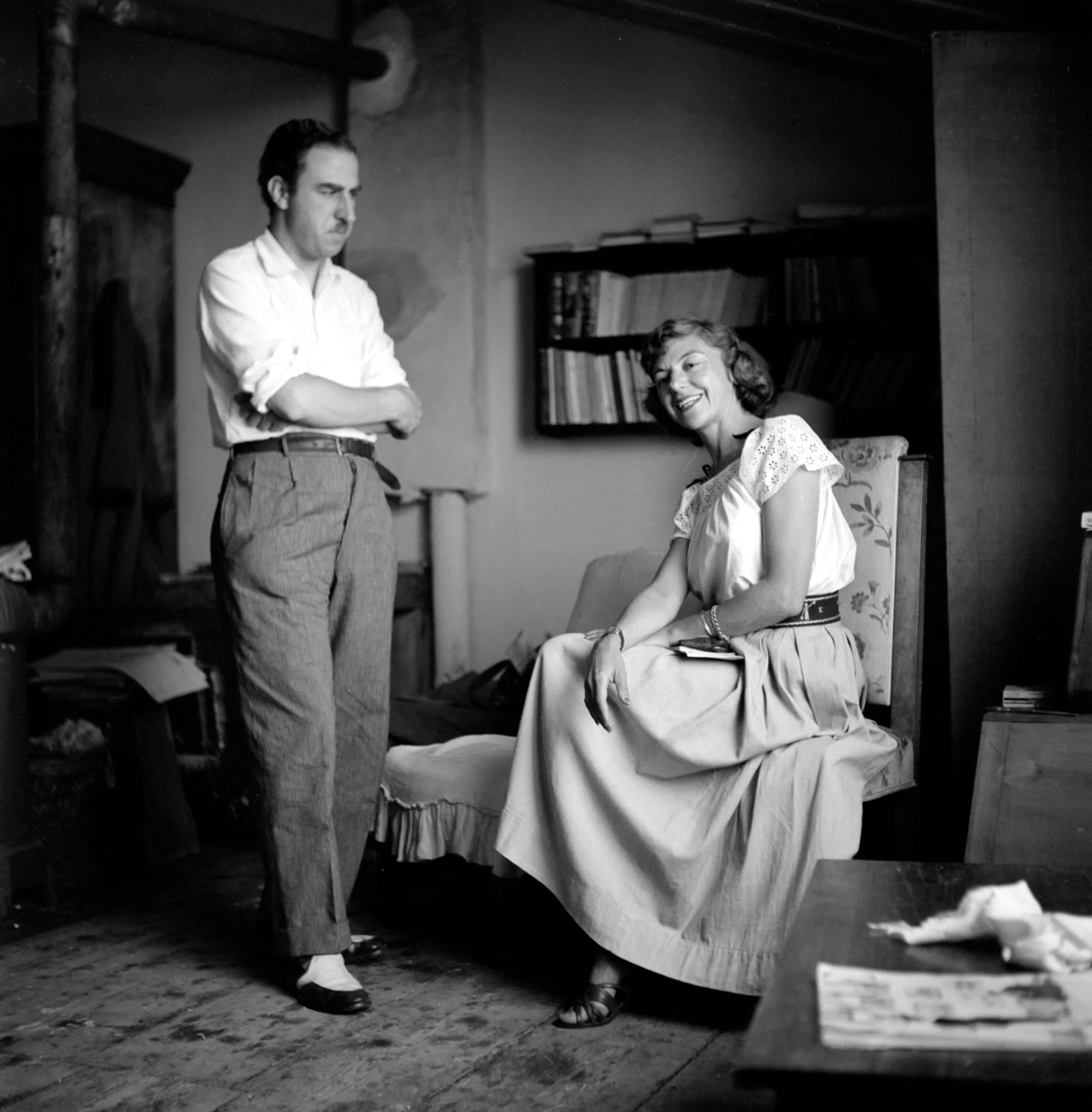 Black and white photograph of a standing man with arms crossed and a seated woman smiling up at him in a cluttered interior