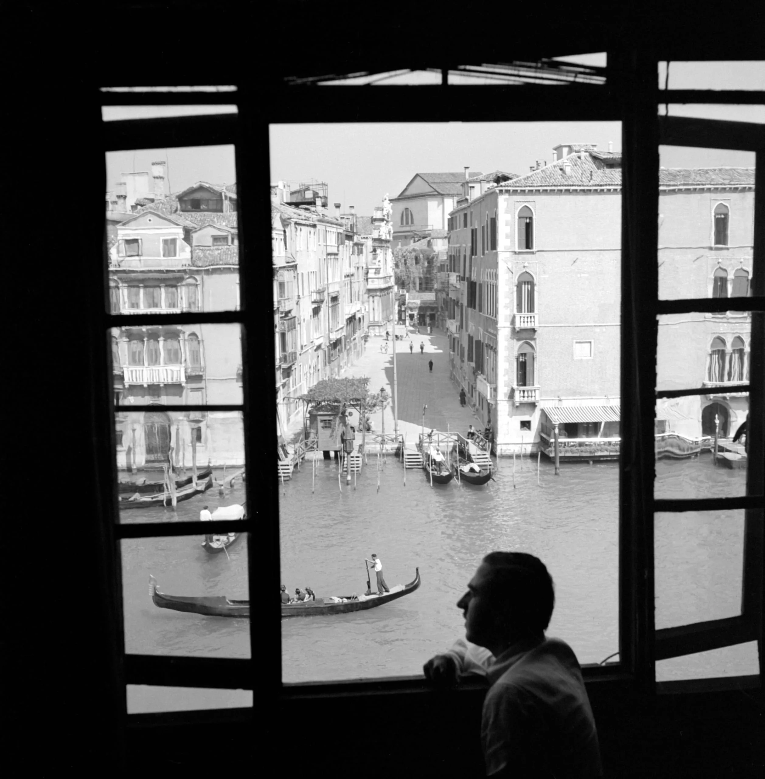 Black and white photograph of a man's silhouette in profile before an open window overlooking a Venetian canal with gondolas and multi-story buildings