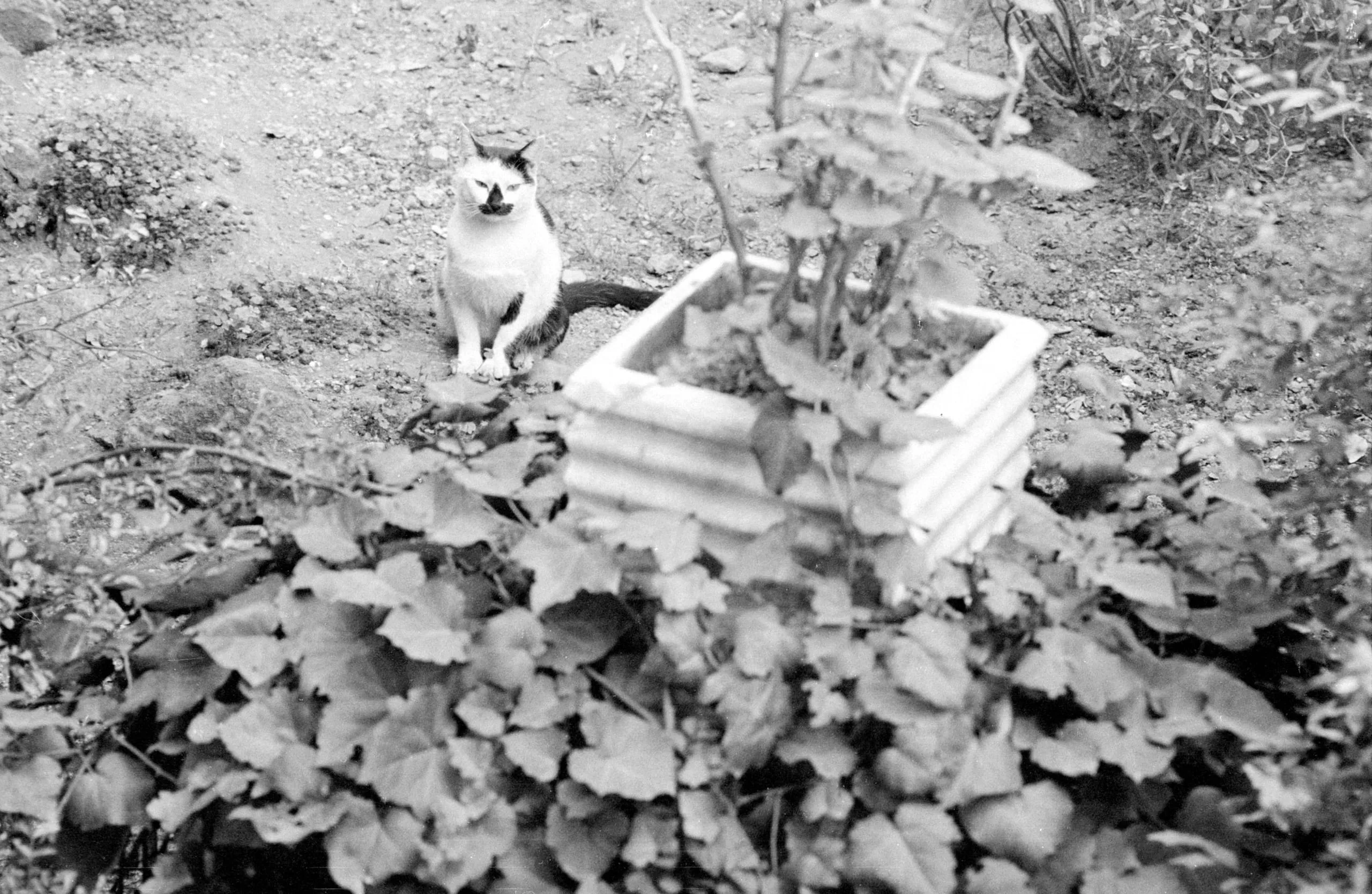 Black and white photograph of a white cat sitting upright in a sandy garden, facing the camera, with a small wooden planter box and leafy plants in the foreground