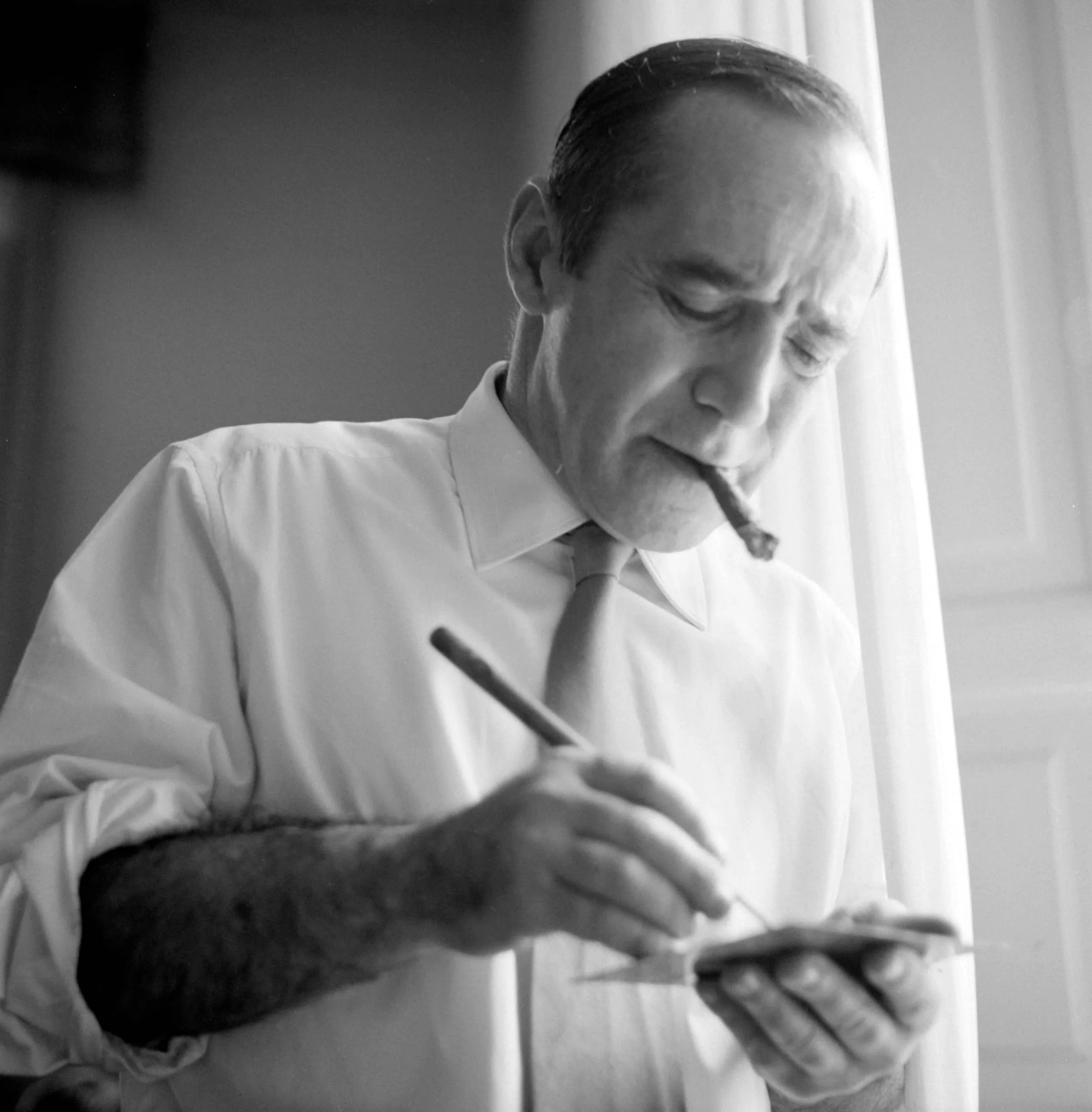 Black and white photograph, a man from the waist up, cigar in mouth, writing in a small notepad with a pencil, soft window light behind him