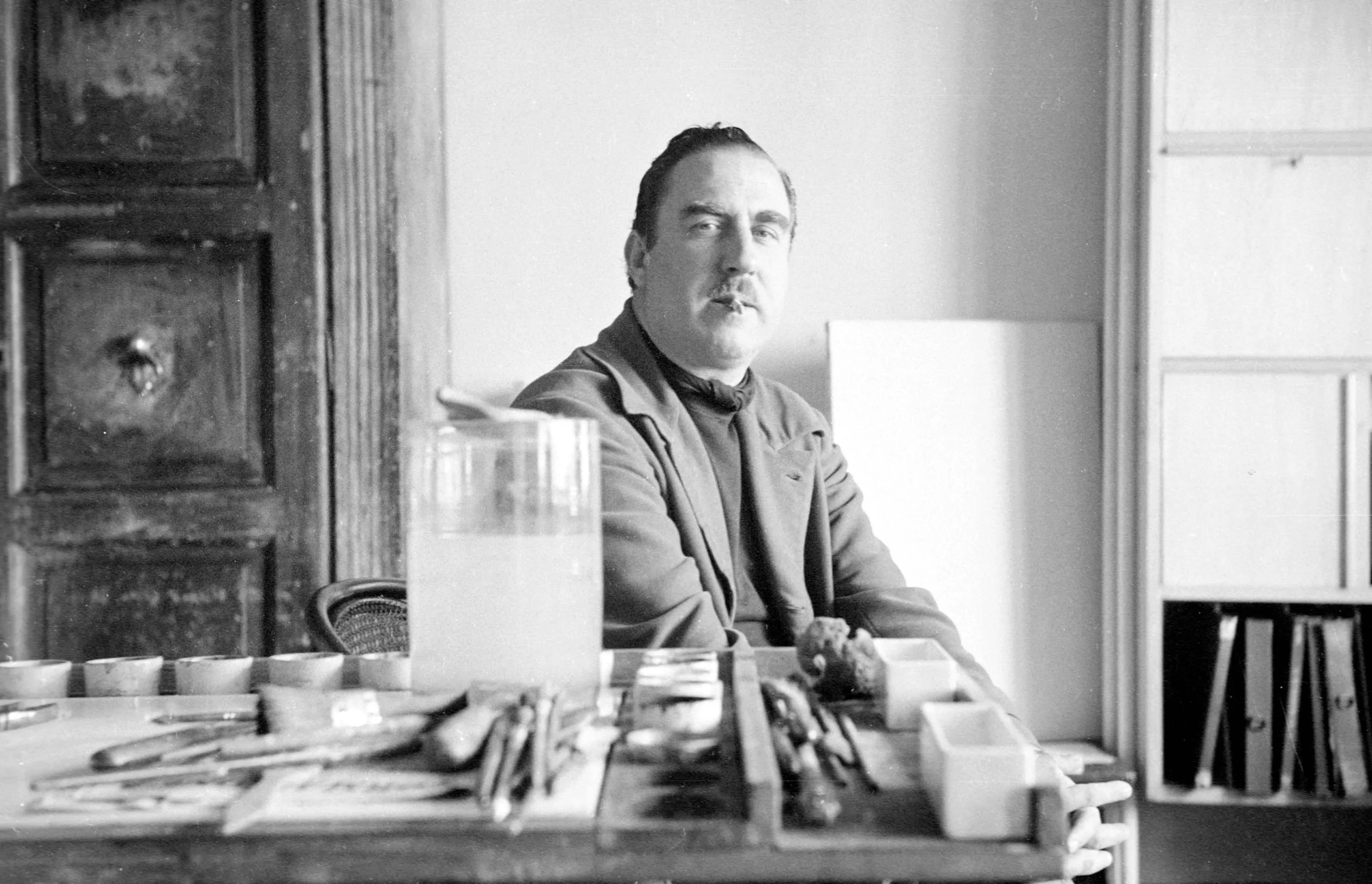 Black and white photograph of a man seated at a worktable spread with brushes, tools, and vessels, looking directly at the camera