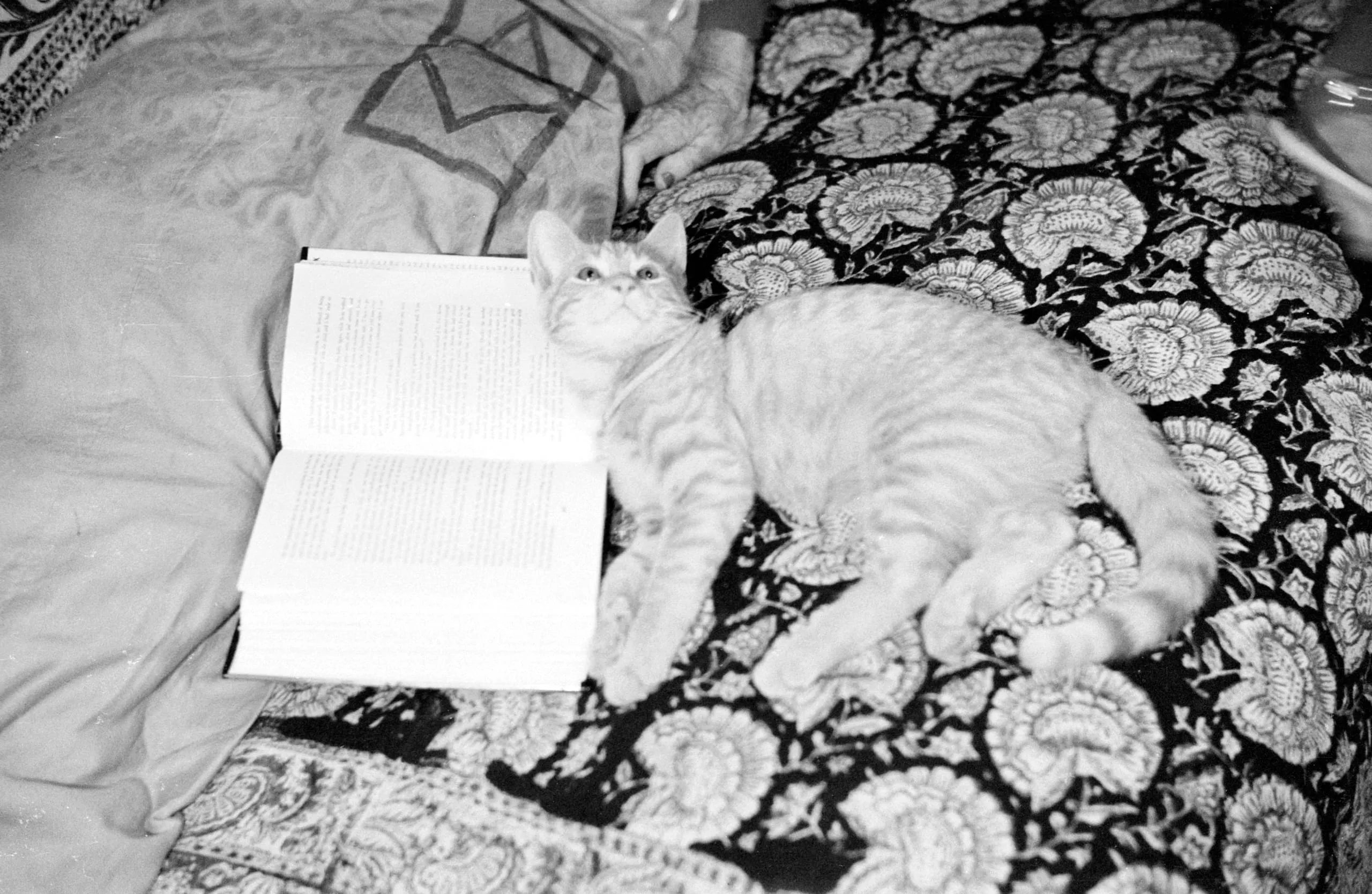 Black and white photograph of a young tabby cat lying on a floral-patterned fabric next to an open book, looking directly at the camera
