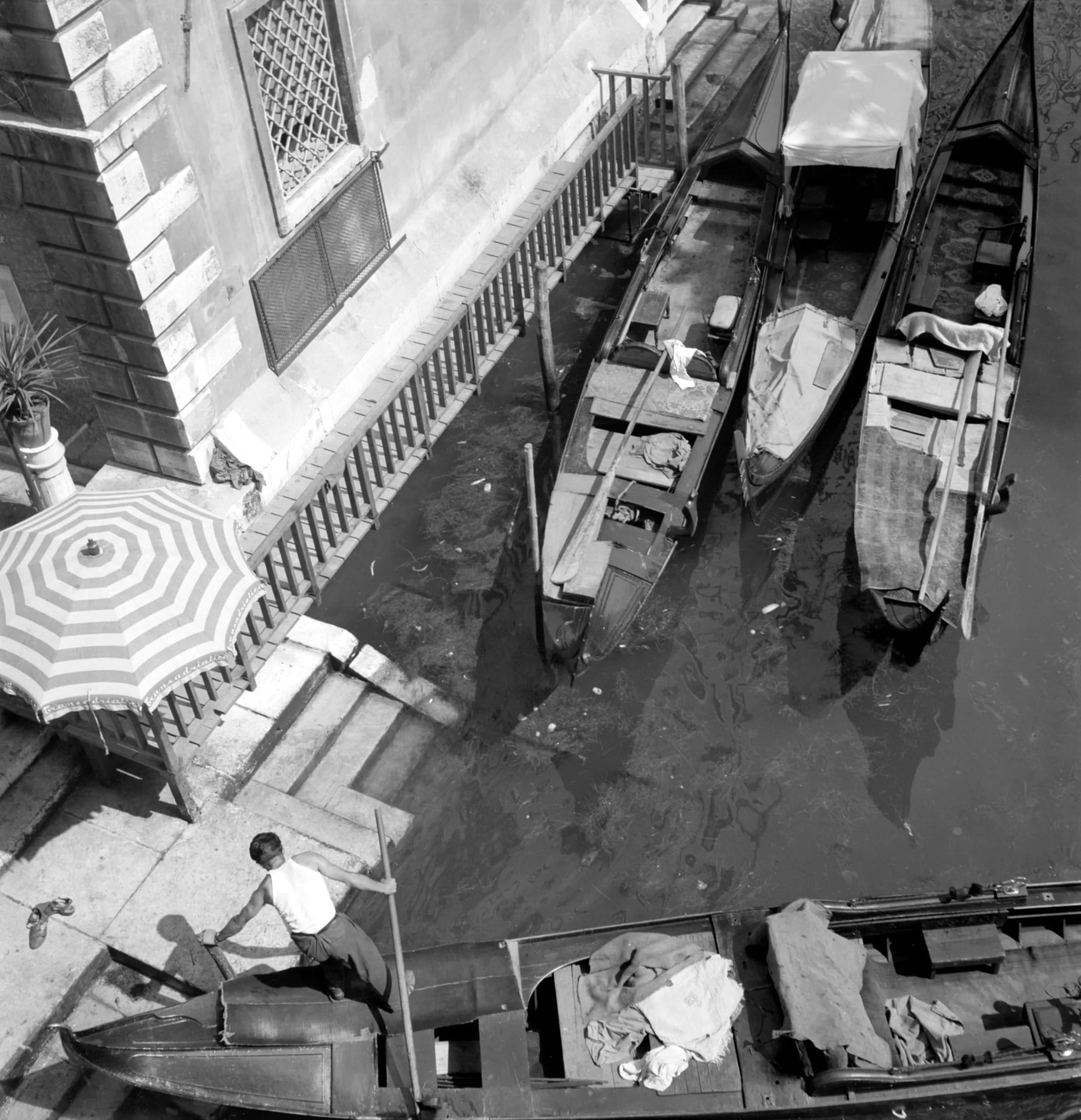 Black and white photograph shot from above, looking down onto a Venetian canal with moored gondolas and a man seated on a boat bow, striped umbrella and stone quay visible to the left
