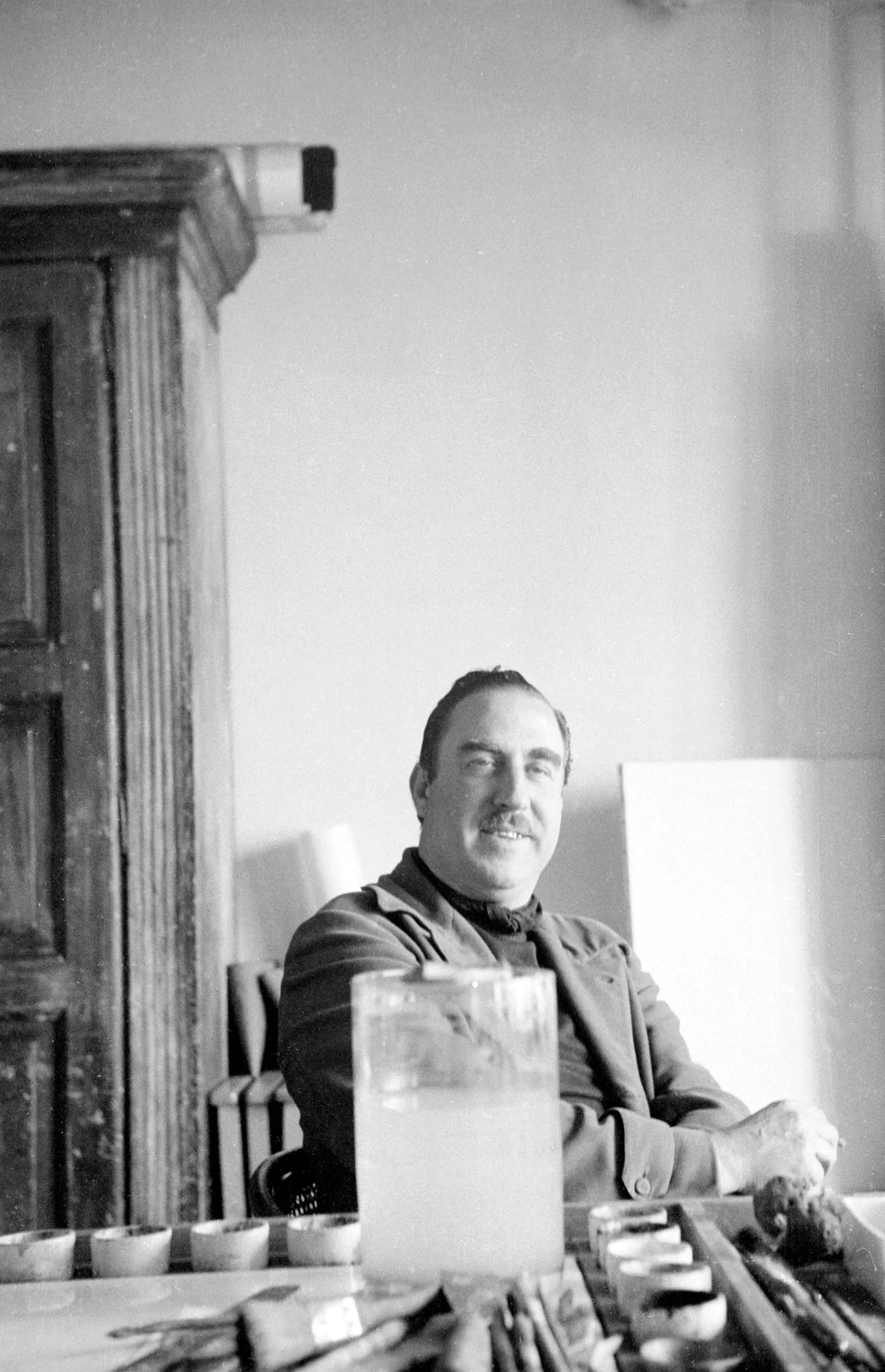 Black and white photograph of a smiling white man seated at a table with paint cups and brushes, a large blank canvas behind him