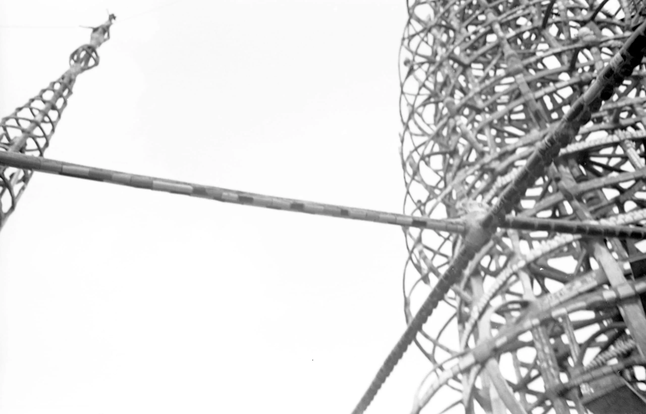 Black and white photograph looking upward at two steel lattice structures: a spiraling curved tower at right and a slender open-frame tower at upper left, connected by a diagonal beam