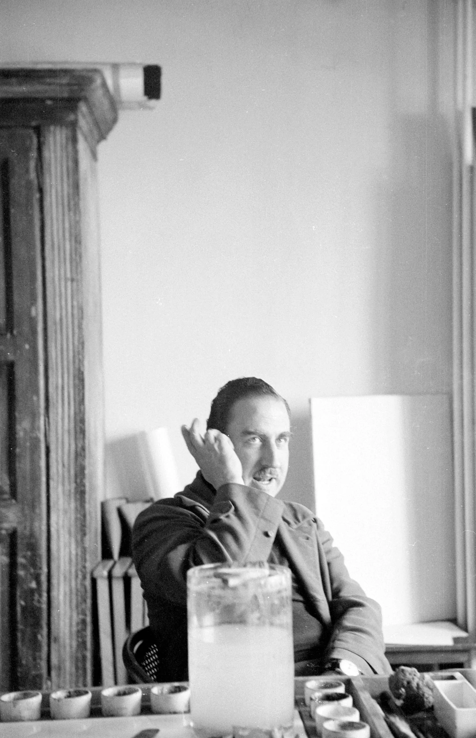Black and white photograph of a man in a military-style jacket seated at a table, head turned toward camera, hand raised near his face, with a glass vessel in the foreground