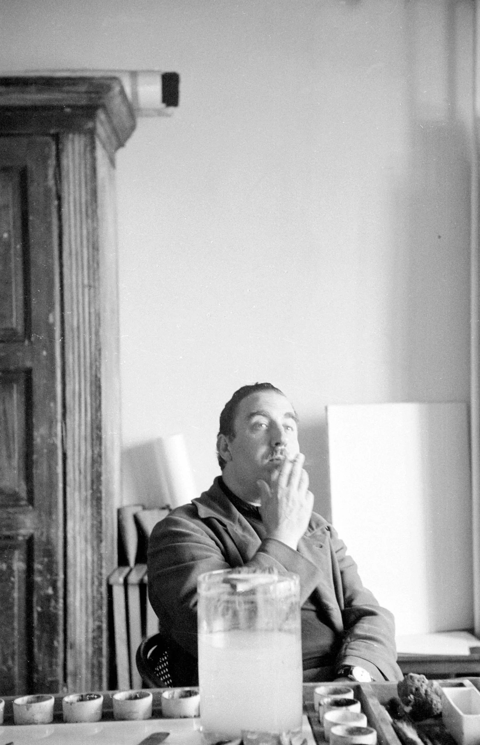 Black and white photograph of a seated white man in a dark jacket, hands raised to his lips, with a glass pitcher and small cups in the foreground