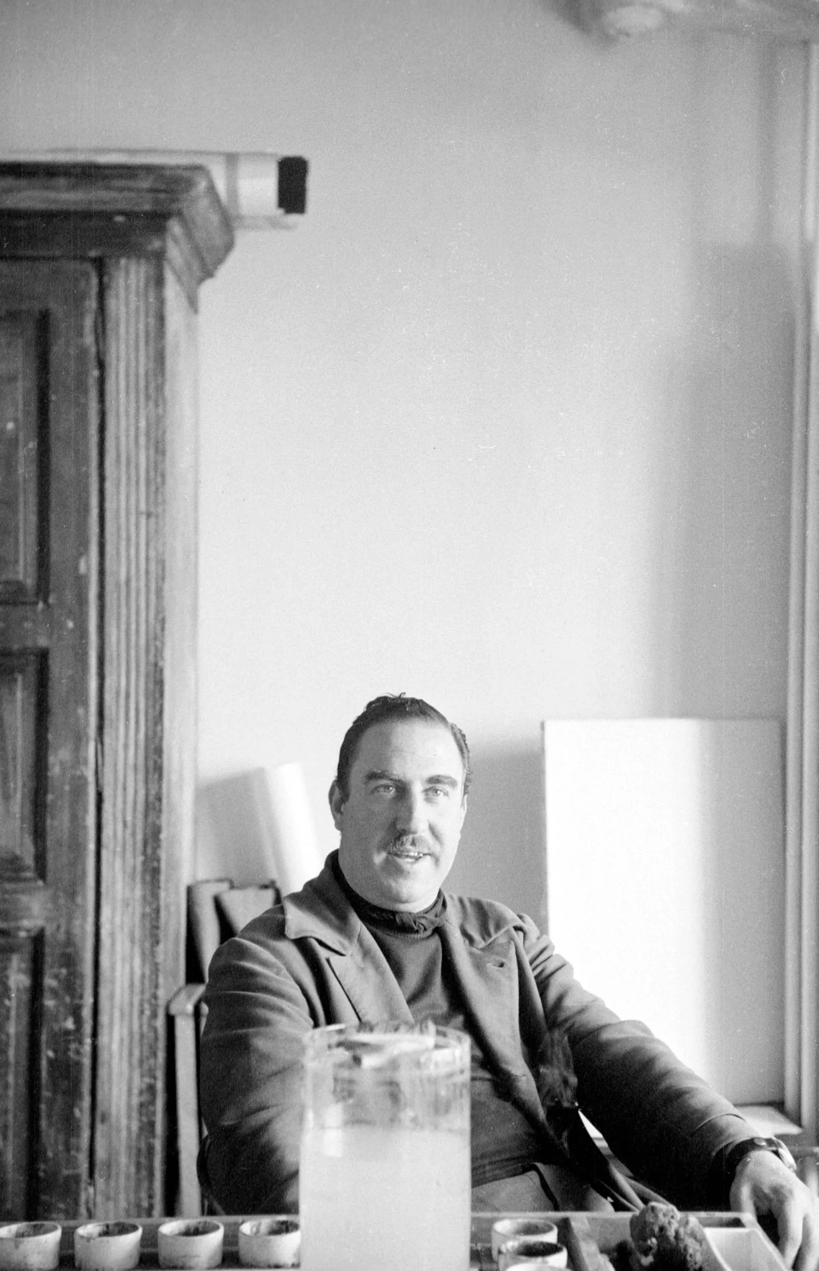 Black and white photograph, white man with a mustache seated in a chair, looking at the camera, dark wooden cabinet to his left, white panel behind him
