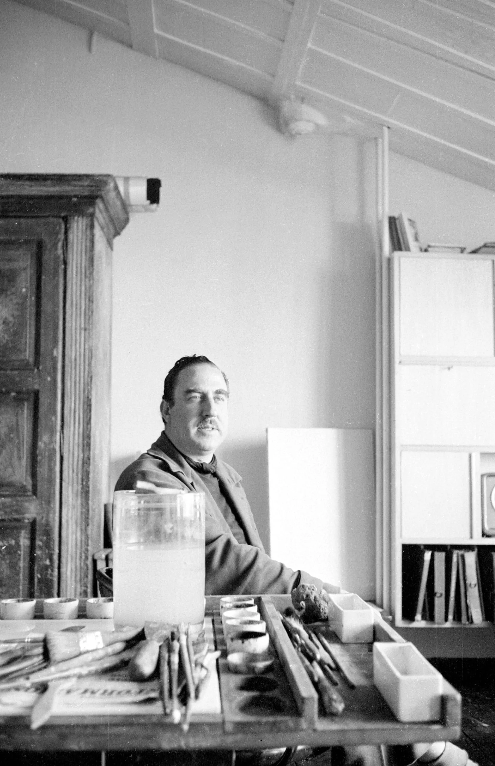 Black and white photograph of a heavyset man with a mustache seated at a worktable in an artist's studio, surrounded by brushes, tools, and a large glass jar