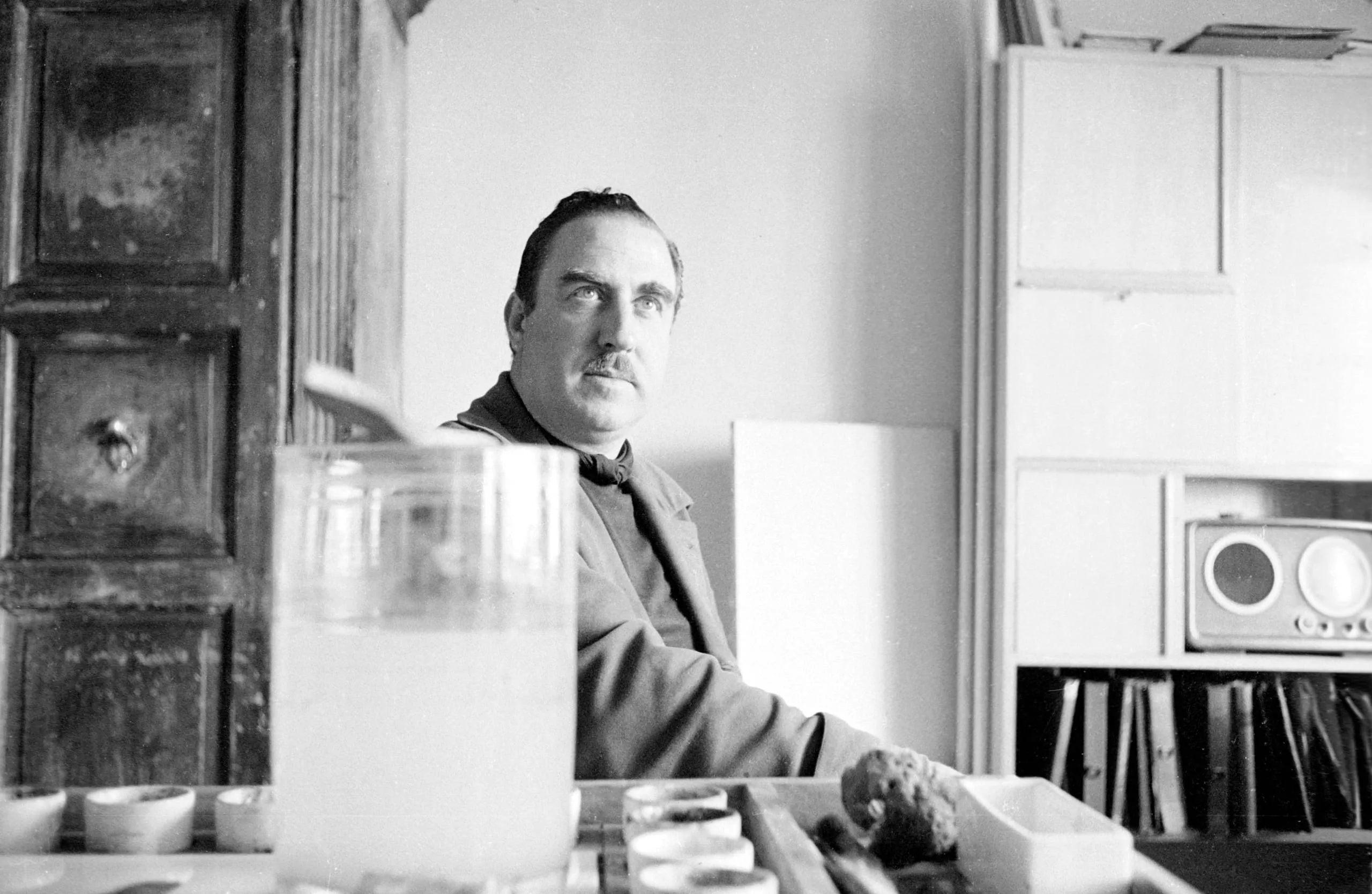 Black and white photograph of a man seated at a table looking up and to the right, with a large glass jar in the foreground and an ornate wooden panel behind him