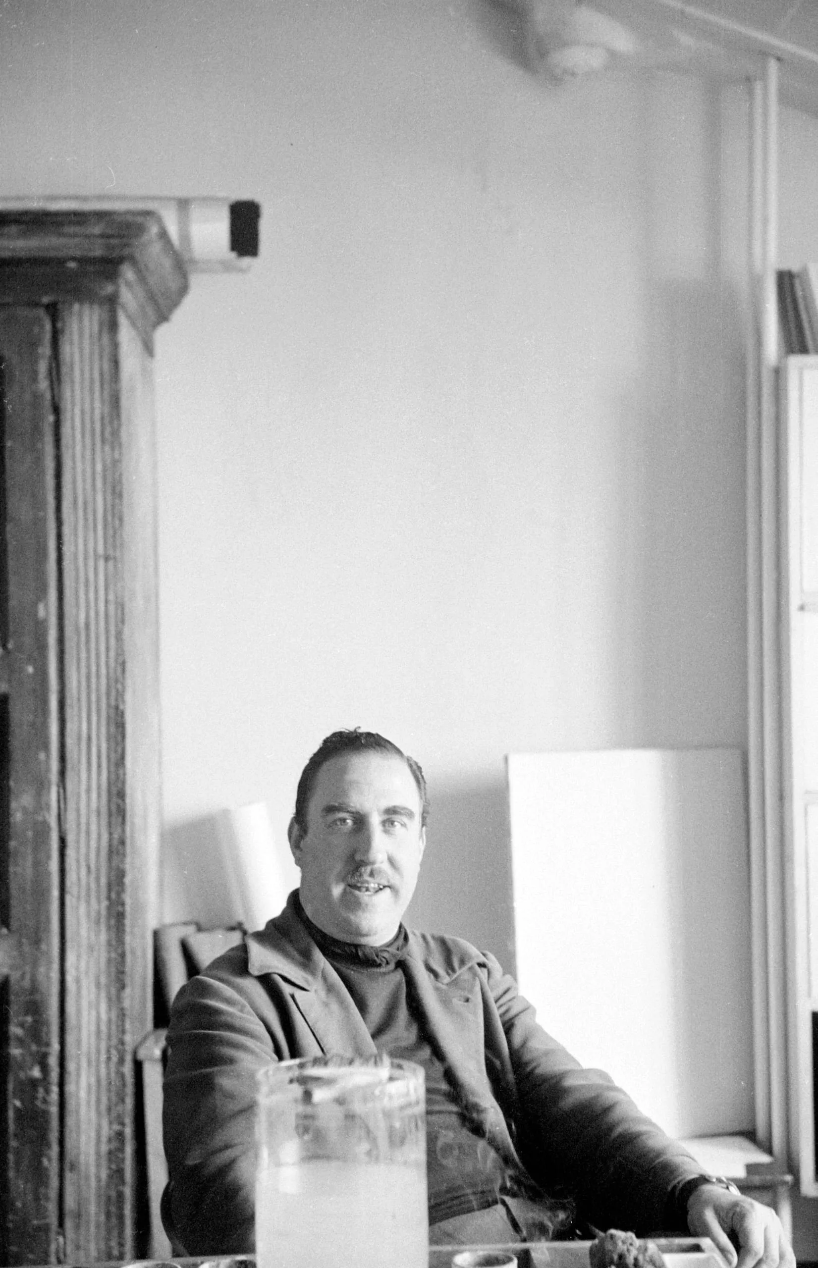 Black and white photograph, white man with short dark hair and a small mustache seated indoors, looking at camera, wearing a turtleneck and jacket
