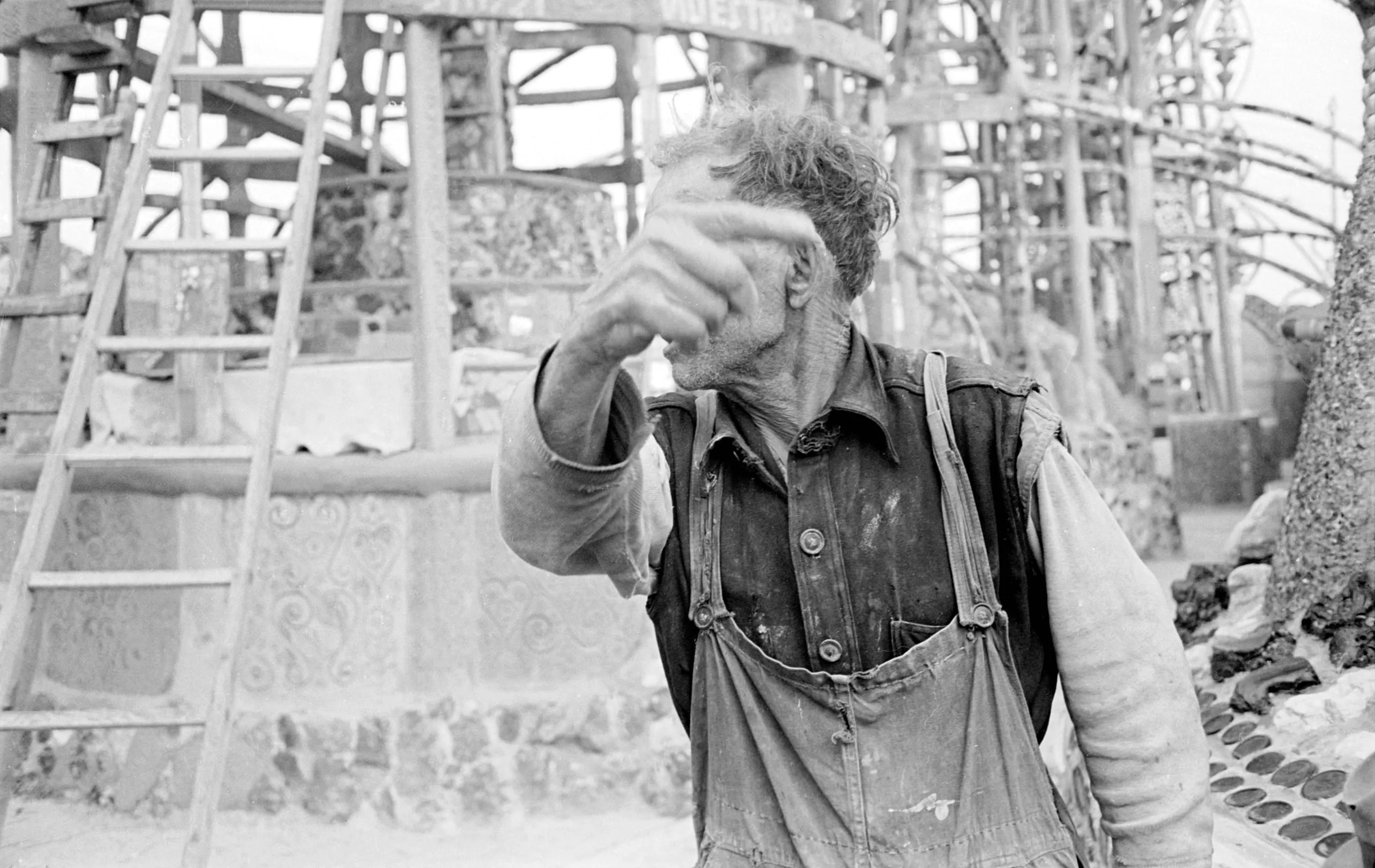 Black and white photograph of a white man in stained denim overalls raising his fist to his face, standing before large concrete and metal tower structures under construction