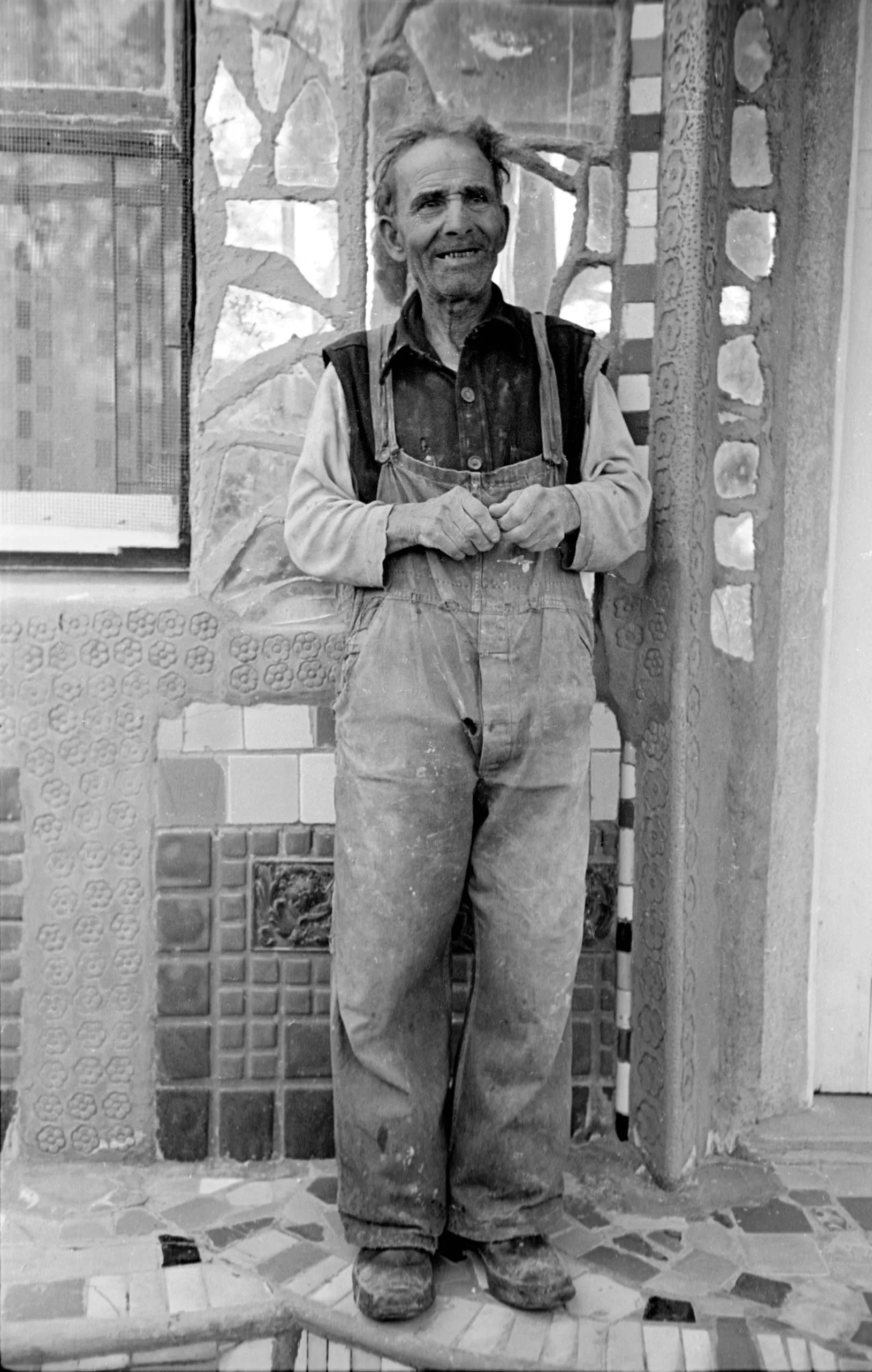 Black and white photograph, full-length portrait of an elderly man in worn overalls leaning against a mosaic-covered column, chin raised, smiling broadly