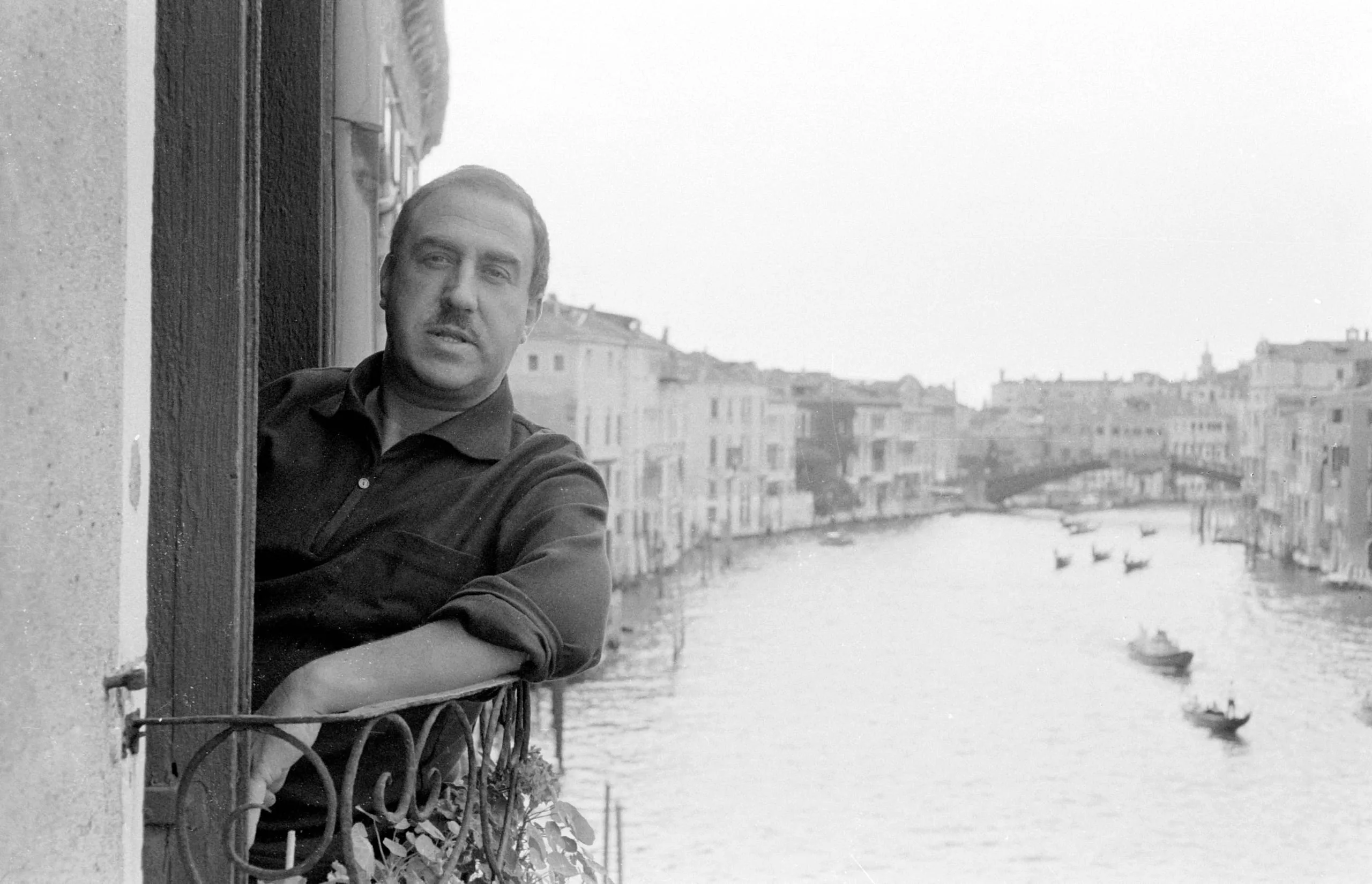 Black and white photograph of a man with a mustache leaning on a wrought-iron balcony, a Venetian canal with boats and buildings receding into the distance behind him